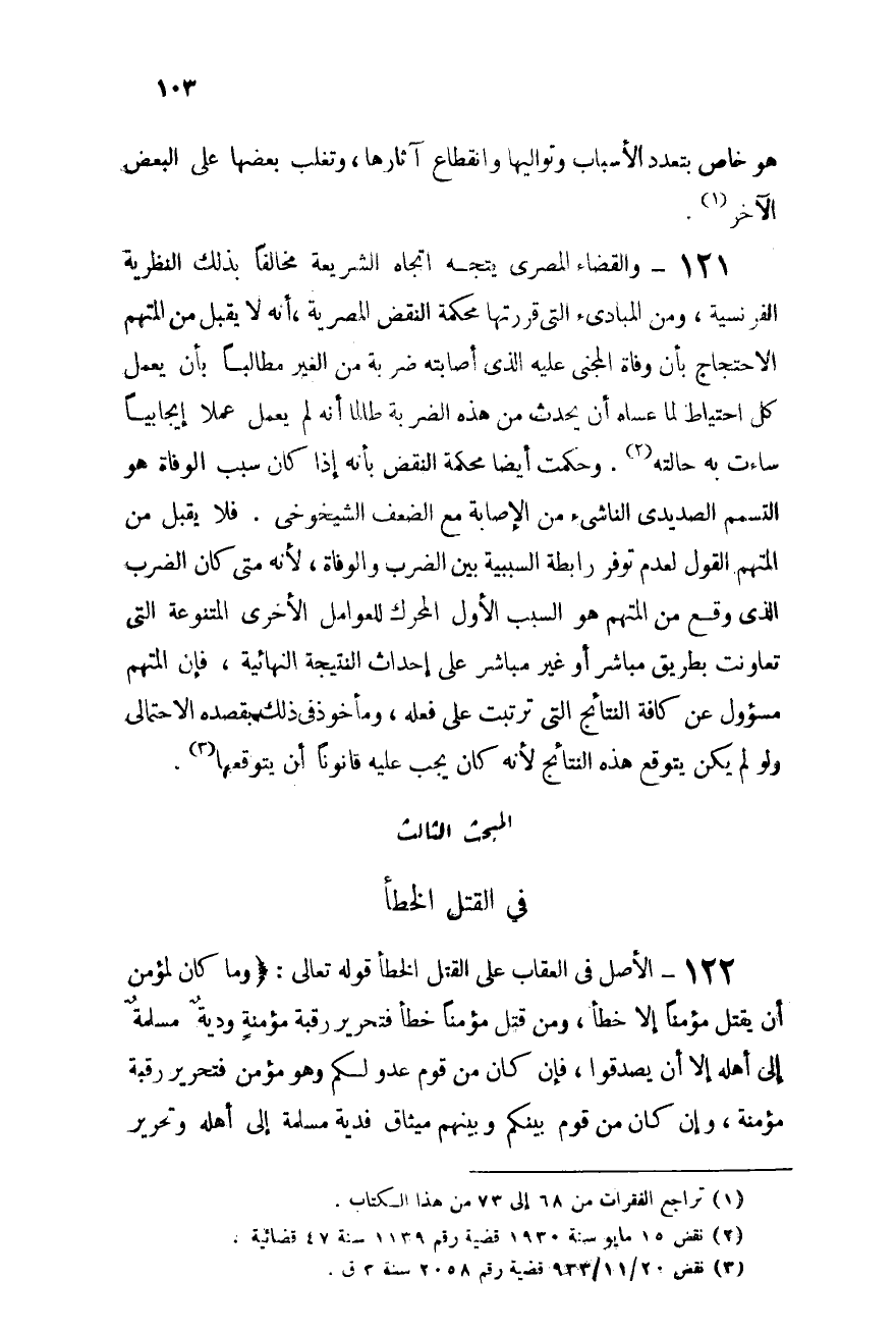122- الأصل فى العقاب على القتل الخطأ: قوله تعالى: {وَمَا كَانَ لِمُؤْمِنٍ أَن يَقْتُلَ مُؤْمِنًا إِلاَّ خَطَئًا وَمَن قَتَلَ مُؤْمِنًا خَطَئًا فَتَحْرِيرُ رَقَبَةٍ مُّؤْمِنَةٍ وَدِيَةٌ مُّسَلَّمَةٌ إِلَى أَهْلِهِ إِلاَّ أَن يَصَّدَّقُوا فَإِن كَانَ مِن قَوْمٍ عَدُوٍّ لَّكُمْ وَهُوَ مُؤْمِنٌ فَتَحْرِيرُ رَقَبَةٍ مُّؤْمِنَةٍ وَإِن كَانَ مِن قَوْمٍ بَيْنَكُمْ وَبَيْنَهُم مِّيثَاقٌ فَدِيَةٌ مُّسَلَّمَةٌ إِلَى أَهْلِهِ وَتَحْرِيرُ