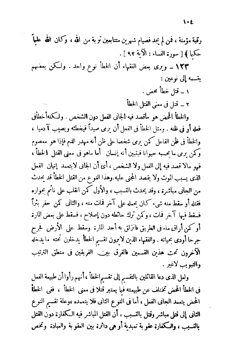 ولعل الذى دعا القائلين بالتقسيم إلى التقسيم الخطأ أنهم رأوا أن طبيعة الفعل فى الخطأ المحض تختلف عن طبيعته فيما يعتبر قتلاً فى معنى الخطأ، ففى الخطأ المحض يتعمد الجانى الفعل، أما فى النوع الثانى فلا يتعمده، وعلة تقسيم النوع الثانى إلى قتل مباشر وقتل بالتسبب: أن القتل المباشر فيه الكفارة دون القتل بالتسبب والكفارة عقوبة تعبدية أو هى دائرة بين العقوبة والعبادة وتخص