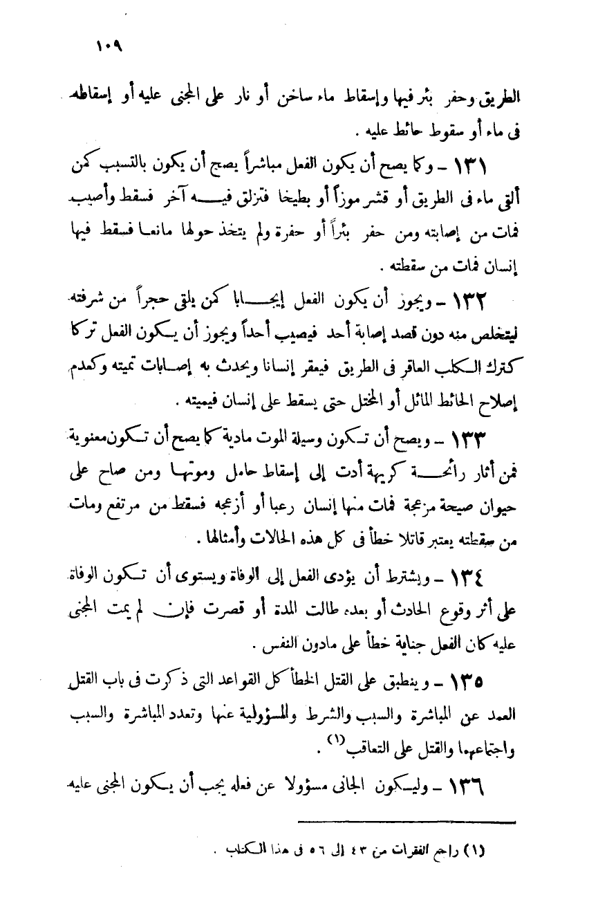 131- وكما يصح أن يكون الفعل مباشرًا يصح أن يكون بالتسبب: كمن ألقى ماء فى الطريق أو قشر موزًا أو بطيخًا فتزلق فيه آخر فسقط وأصيب فمات من إصابته ومن حفر بئرًا أو حفرة ولم يتخذ حولها مانعًا فسقط فيه إنسان فمات من سقطته.