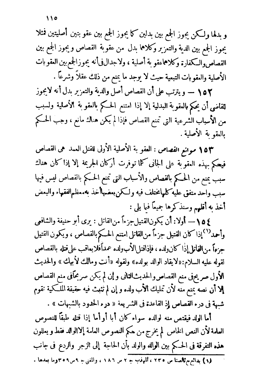 153 - موانع القصاص: العقوبة الأصلية الأولى للقتل العمد هى القصاص فيحكم بهذه العقوبة على الجانى كلما توفرت أركان الجريمة، إلا إذا كان هناك سبب يمنع من الحكم بالقصاص. والأسباب التى تمنع الحكم بالقصاص ليس فيها سبب واحد متفق عليه فكلها مختلف فيه ولكن بعضها أخذ به معظم الفقهاء والبعض أخذ به أقلهم وسنذكرها جميعًا فيما يلى: