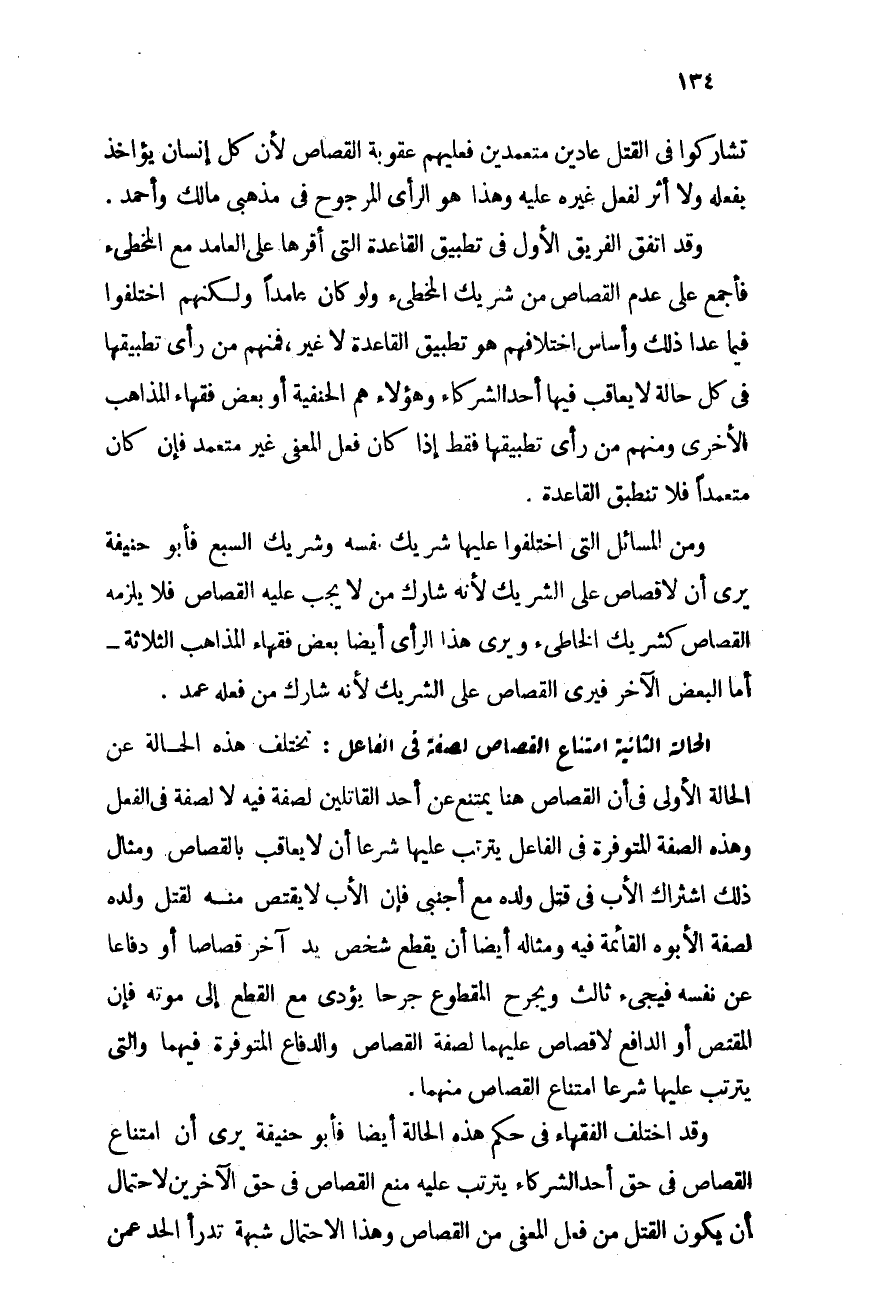 وقد اتفق الفريق الأول فى تطبيق القاعدة التى أقرها على العامد مع المخطئ فأجمع على عدم القصاص من شريك المخطئ ولو كان عامدًا، ولكنهم اختلفوا فيما عدا ذلك وأساس اختلافهم هو تطبيق القاعدة لا غير، فمنهم من رأى تطبيقها فى كل حالة لا يعاقب فيها أحد الشركاء وهؤلاء هم الحنفية أو بعض فقهاء المذاهب الأخرى، ومنهم من رأى تطبيقها فقط إذا كان فعل المعفى غير متعمد فإن كان متعمدًا فلا تنطبق القاعدة.