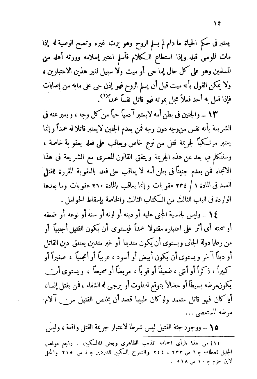 13 - والجنين فى بطن أمه لا يعتبر آدميًّا حيًّا من كل وجه: ويعبر عنه فى الشريعة بأنه نفس من وجه، دون وجه فمن يعدم الجنين لا يعتبر قاتلاً له عمدًا، وإنما يعتبر مرتكبًا لجريمة قتل من نوع خاص، ويعاقب على فعله بعقوبة خاصة، وسنتكلم فيما بعد عن هذه الجريمة.