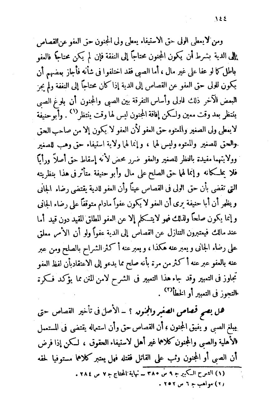 ومن لا يعطى الولى حق الاستيفاء يعطى ولى المجنون حق العفو عن القصاص إلى الدية، بشرط أن يكون المجنون محتاجًا إلى النفقة، فإن لم يكن محتاجًا فالعفو باطل كما لو عفا على غير مال. أما الصبى فقد اختلفوا فى شأنه: فأجاز بعضهم أن يكون للولى حق العفو عن القصاص إلى الدية إذا كان محتاجًا إلى النفقة ولم يجز البعض الآخر ذلك للولى. وأساس التفرقة بين الصبى والمجنون أن بلوغ الصبى ينتظر بعد وقت معين ولكن إفاقة المجنون ليس لها وقت ينتظر (¬1) . وأبو حنيفة لا يعطى ولى الصغير والمعتوه حق العفو لأن العفو لا يكون إلا من صاحب الحق والحق للصغير والمعتوه وليس لهما، وإنما لهما ولاية استيفاء حق وهب للصغير، وولايتهما مقيدة بالنظر للصغير والعفو ضرر محض لأنه إسقاط حق أصلاً ورأيًا فلا يملكانه وإنما لهما حق الصلح على مال. وأبو حنيفة متأثر فى هذا بنظريته التى تقضى بأن حق الولى فى القصاص عينًا وأن العفو للدية يقتضى رضاء الجانى، ويظهر أن أبا حنيفة يرى أن العفو لا يكون عفوًا ما دام متوقفًا على رضاء الجانى وإنما يكون صلحًا ولذلك فهو لا يتكلم إلا عن العفو المطلق دون قيد. أما عند مالك فيعتبرون التنازل عن القصاص إلى الدية عفوًا ولو أن الأمر معلق على رضاء الجانى، ويعبر عنه هكذا ويعبر عنه أكثر الشراح بالصلح، ومن عبر عنه بالعفو عبر عنه أكثر من مرة بأنه صلح، مما يدعو إلى الاعتقاد بأن لفظ العفو تجاوز فى التعبير، وقد جاء هذا التعبير فى الشرح لا فى المتن مما يؤكد فكرة التجوز فى التعبير أو الخطأ (¬2) .