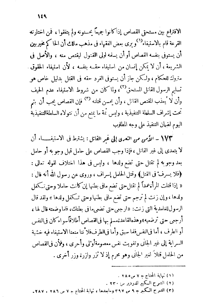 173- الأمن من التعدى إلى غير القاتل: يشترط فى الاستيفاء أن لا يتعدى إلى غير القاتل فإذا وجب القصاص على حامل قبل وجوبه أو حامل بعد وجوبه لم تقتل حتى تضع ولدها، وليس فى هذا اختلاف؛ لقوله تعالى: {فَلاَ يُسْرِف فِّى القَتْل} [الإسراء:33] وقتل الحامل إسراف، وروى عن رسول الله - صلى الله عليه وسلم - أنه قال: "إذا قتلت المرأة عمدًا لم تقتل حتى تضع ما فى بطنها إن كانت حاملاً وحتى تكفل ولدها، وإن زنت لم ترجم حتى تضع ما فى بطنها وحتى تكفل ولدها"، ولقد قال الرسول للغامدية التى زنت: "ارجعى حتى تضعى ما فى بطنك" فلما وضعته قال لها "ارجعى حتى ترضعيه" وهذه القاعدة مسلم بها فى القصاص إطلاقًا سواء كان فى النفس أو الطرف أما فى النفس فلما سبق، وأما فى الطرف فلأننا منعنا الاستيفاء فيه خشية السراية إلى غير الجانب وتفويت نفس معصومة أولى وأحرى ولأن فى القصاص من لحامل قتلاً لغير الجانى وهو محرم إذ لا تزر وازرة وزر أخرى.
