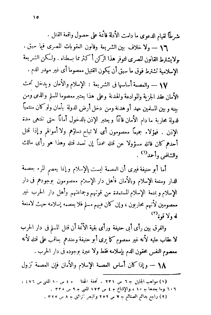 16 - ولا خلاف بين الشريعة وقانون العقوبات المصرى فيما سبق: ولا يشترط القانون المصرى لتوفر هذا الركن أكثر مما بسطناه. ولكن الشريعة الإسلامية تشترط فوق ما سبق أن يكون القتيل معصومًا؛ أى: غير مهدر الدم.