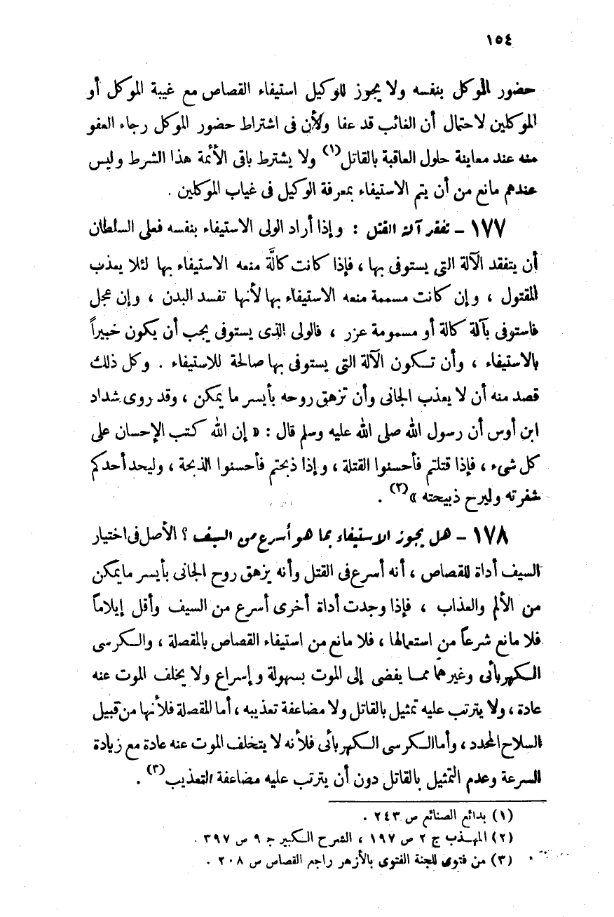 177- تفقد آلة القتل: وإذا أراد الوالى الاستيفاء بنفسه فعلى السلطان أن يتفقد الآلة التى يستوفى بها، فإذا كانت كالَّة منعه الاستيفاء بها لئلا يعذب المقتول، وإن كانت مسمومة منعه الاستيفاء بها لأنها تفسد البدن، وإن عجل فاستوفى بآلة كالة أو مسمومة عُزِّر، فالولى الذى يستوفى يجب أن يكون خبيرًا بالاستيفاء، وأن تكون الآلة التى يستوفى بها صالحة للاستيفاء. وكل ذلك قصد منه أن لا يعذب الجانى وأن تزهق روحه بأيسر ما يمكن، وقد روى شداد بن أوس أن رسول الله - صلى الله عليه وسلم - قال: "إن الله كتب الإحسان على كل شئ فإذا قتلتم فأحسنوا القتْلة، وإذا ذبحتم فأحسنوا الذِّبْحة وليُحدَّ أحدكم شفرته وليُرحْ ذبيحته" (¬2) .