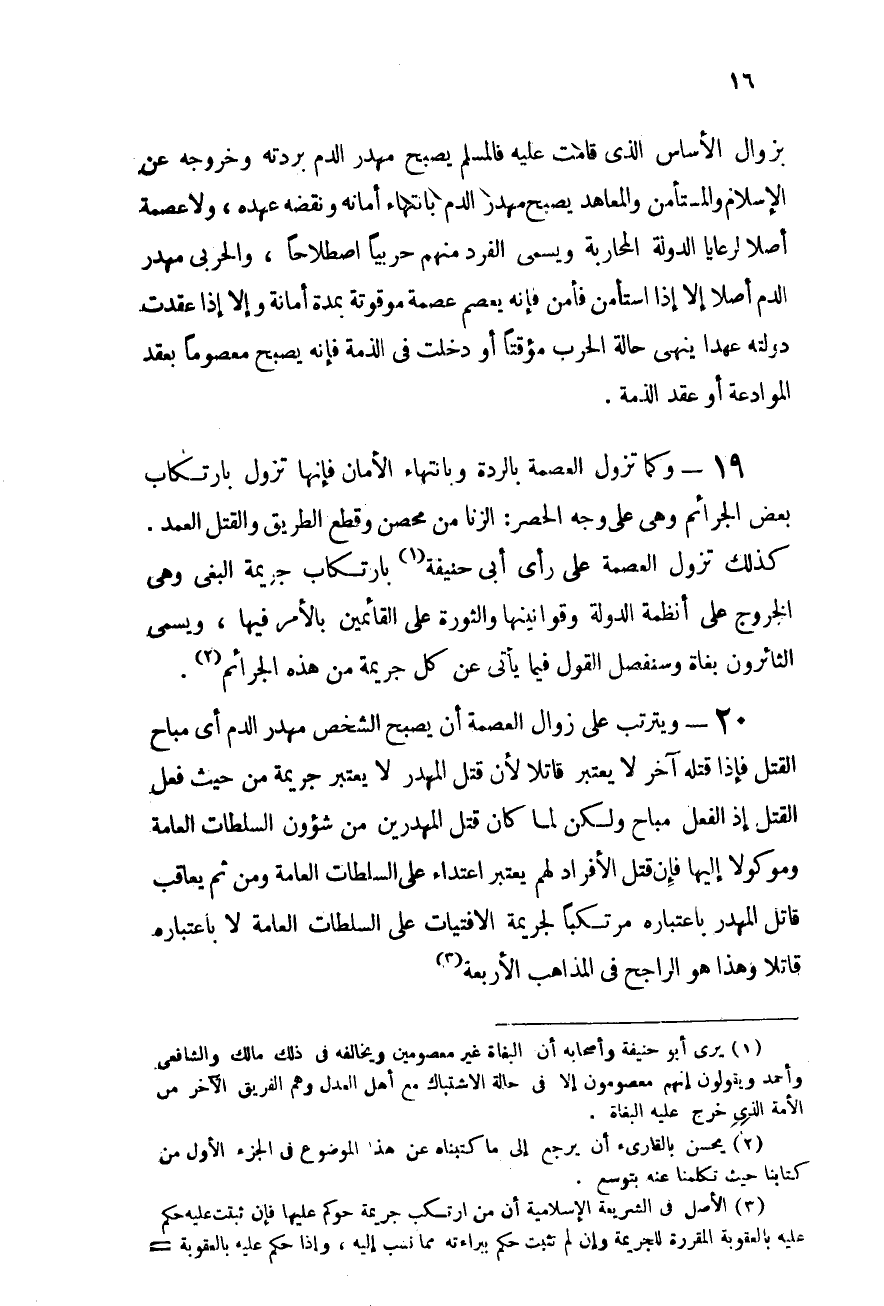 19 - وكما تزول العصمة بالردة وبانتهاء الأمان فإنها تزول بارتكاب بعض الجرائم: وهى على وجه الحصر: الزنا من محصن، وقطع الطريق، والقتل العمد. كذلك تزول العصمة - على رأى أبى حنيفة (¬1) - بارتكاب جريمة البغى وهى الخروج على أنظمة الدولة وقوانينها والثورة على القائمين بالأمر فيها، ويسمى الثائرون بغاة. وسنفصل القول فيما يأتى عن كل جريمة من هذه الجرائم (¬2) .