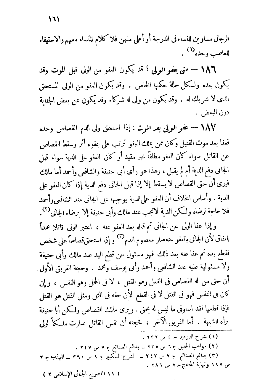 186- متى يعفو الولى؟: قد يكون العفو من الولى قبل الموت وقد يكون بعده، ولكل حالة حكمها الخاص. وقد يكون العفو من الولى المستحق الذى لا شريك له، وقد يكون من ولى له شركاء وقد يكون عن بعض الجناية دون البعض.