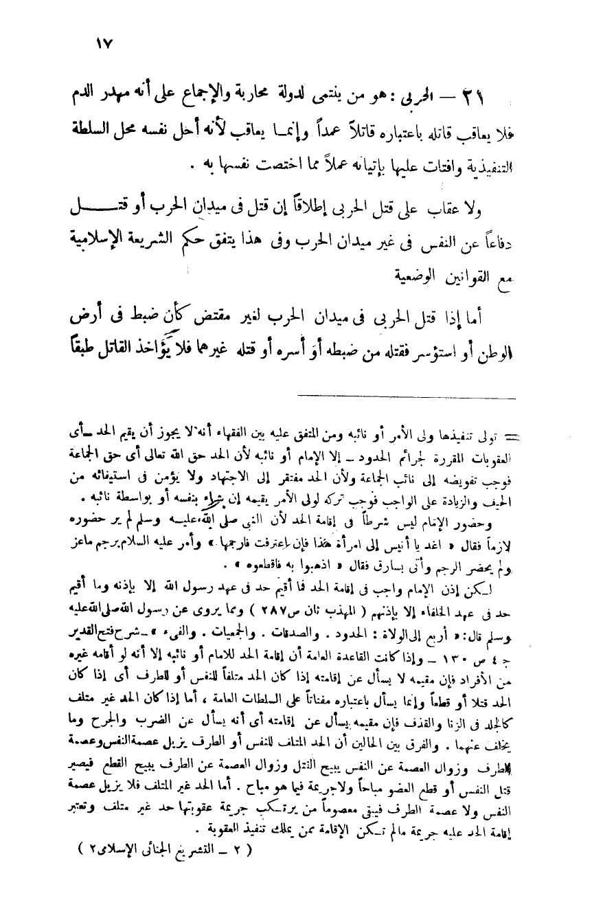 21 - الحربى: هو من ينتمى لدولة محاربة، والإجماع على أنه مهدر الدم فلا يعاقب قاتله باعتباره قاتلاً عمدًا وإنما يعاقب لأنه أحل نفسه محل السلطة التنفيذية وافتات عليها بإتيانه عملاً مما اختصت نفسها به.