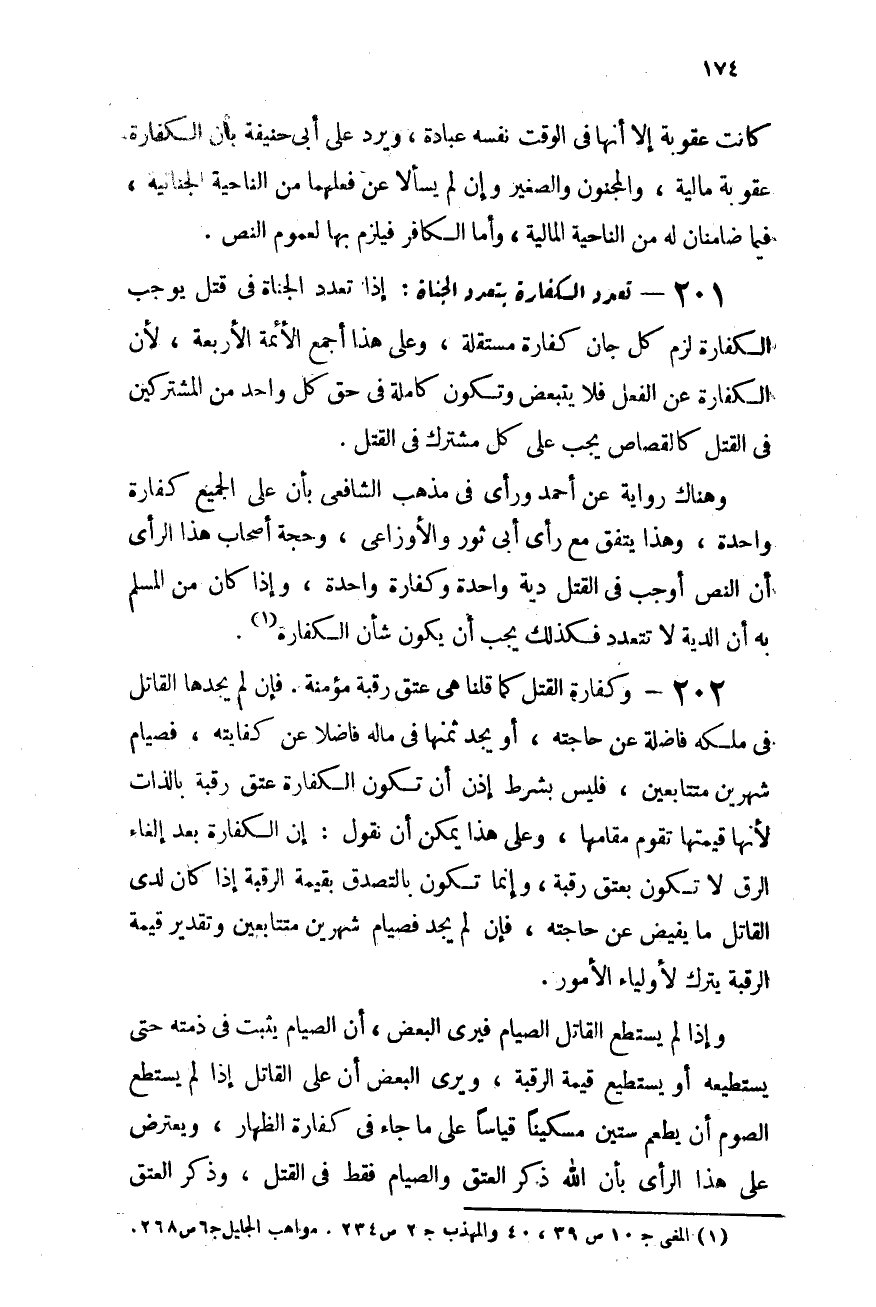 201- تعدد الكفارة بتعدد الجناة: إذا تعدد الجناة فى قتل يوجب الكفارة لزم كل جان كفارة مستقلة، وعلى هذا أجمع الأئمة الأربعة؛ لأن الكفارة عن الفعل فلا تتبعض، وتكون كاملة فى حق كل واحد من المشتركين فى القتل كالقصاص يجب على كل مشترك فى القتل.