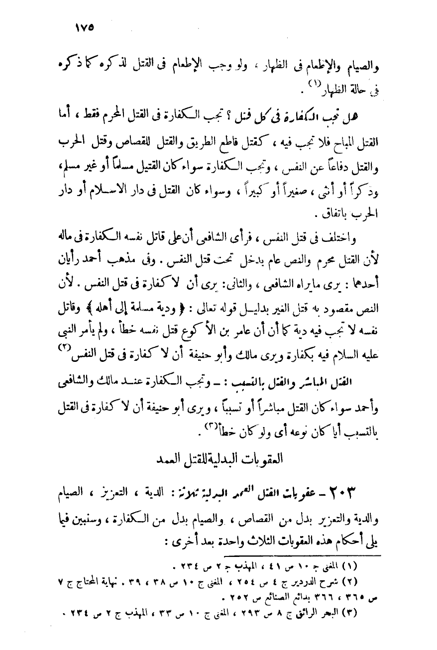203- عقوبات القتل العمد البدلية ثلاثة: الدية، والتعزير، والصيام. والدية والتعزير بدل من القصاص والصيام بدل من الكفارة، وسنبين فيما يلى أحكام هذه العقوبات الثلاث واحدة بعد الأخرى.