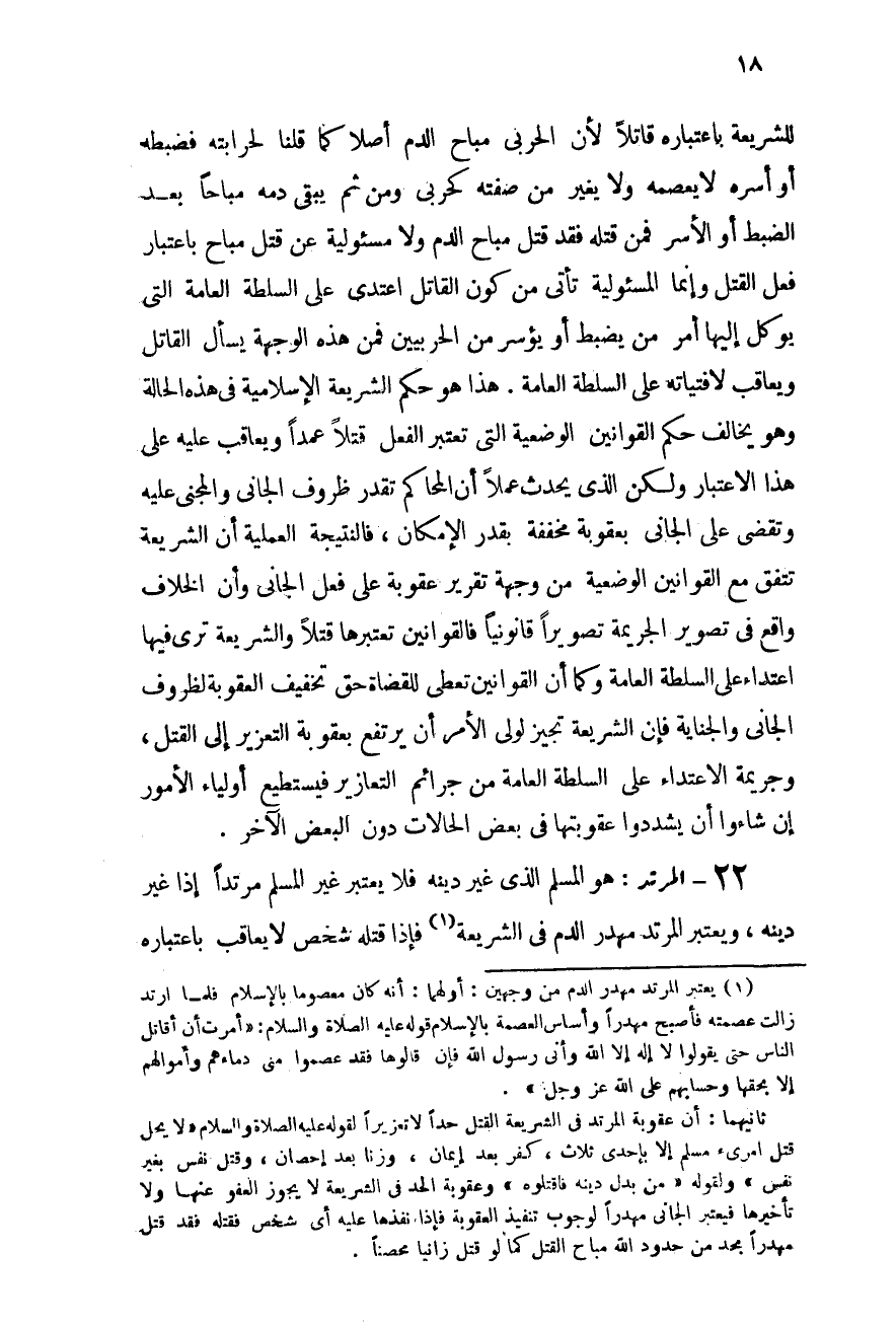... ثانيهما: أن عقوبة المرتد فى الشريعة القتل حداً لا تعزيزاً لقوله عليه الصلاة والسلام: "لا يحل قتل امرئ مسلم إلا بإحدى ثلاث: كفر بعد إيمان , وزناً بعد أحصان , وقتل نفس بغير نفس" ولقوله: "من بدل دينه فاقتلوه" وعقوبة الحد فى الشريعة لا يجوز العفو عنها ولا تأخيرها فيعتبر الجانى مهدراً لوجوب تنفيذ العقوبة فإذا نفذها عليه أى شخص فقتله فقد قتل مهدراً بحد من حدود الله مباح القتل كما لو قتل زانياً محصناً.