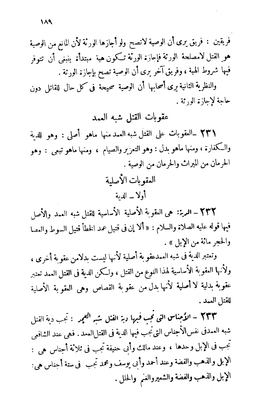 232- الدية: هى العقوبة الأصلية الأساسية للقتل شبه العمد، والأصل فيها قوله عليه الصلاة والسلام: "ألا إن فى قتيل عمد الخطأ قتيل السوط والعصا والحجر مائة من الإبل".