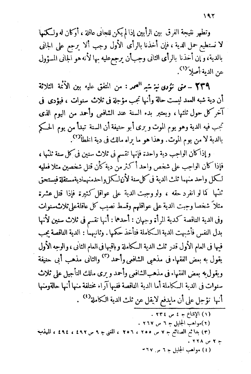239- متى تؤدى دية شبه العمد؟: من المتفق علبه الأئمة الثلاثة أن دية شبه العمد ليست حالَّة وأنها تجب مؤجلة فى ثلاث سنوات فيؤدى فى آخر كل حول ثلثها ويعتبر بدء السنة عند الشافعى وأحمد من اليوم الذى تجب فيه الدية وهو يوم الموت ويرى أبو حنيفة أن السنة تبدأ من يوم الحكم بالدية لا من يوم الموت. وهذا هو ما يراه مالك فى دية الخطأ (¬2) .