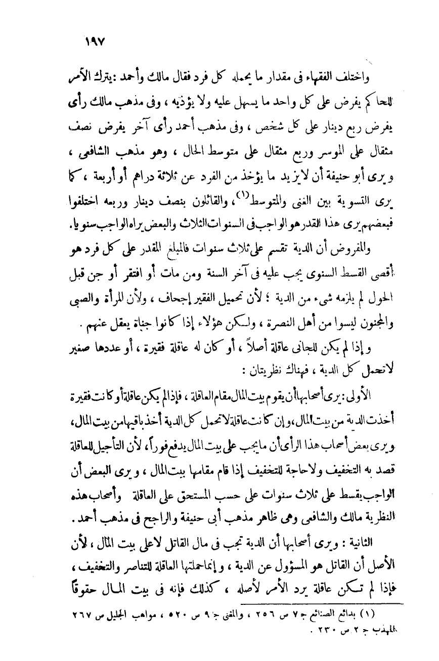 والمفروض أن الدية تقسم على ثلاث سنوات، فالمبلغ المقدر على كل فرد هو أقصى القسط السنوى ويجب عليه فى آخر السنة، ومن مات أو افتقر أو جن قبل الحول لم يلزمه شئ من الدية؛ لأن تحميل الفقير إجحاف ولأن المرأة والصبى والمجنون ليسوا من أهل النصرة، ولكن هؤلاء إذا كانوا جناة يعقل عنهم.