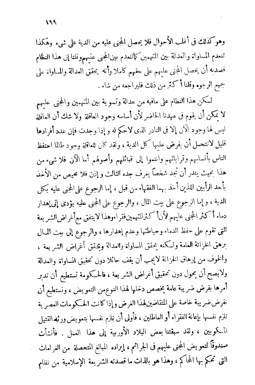 وهو كذلك فى أغلب الأحوال فلا يحصل المجنى عليه من الدية على شئ، وهكذا تنعدم المساواة والعدالة بين المتهمين كما تنعدم بين المجنى عليهم. وقلنا إن هذا النظام قصد به أن يحصل المجنى عليهم على حقهم كاملاً وأنه يحقق العدالة والمساواة على جميع الوجوه، وقلنا أكثر من ذلك فليراجعه من شاء.