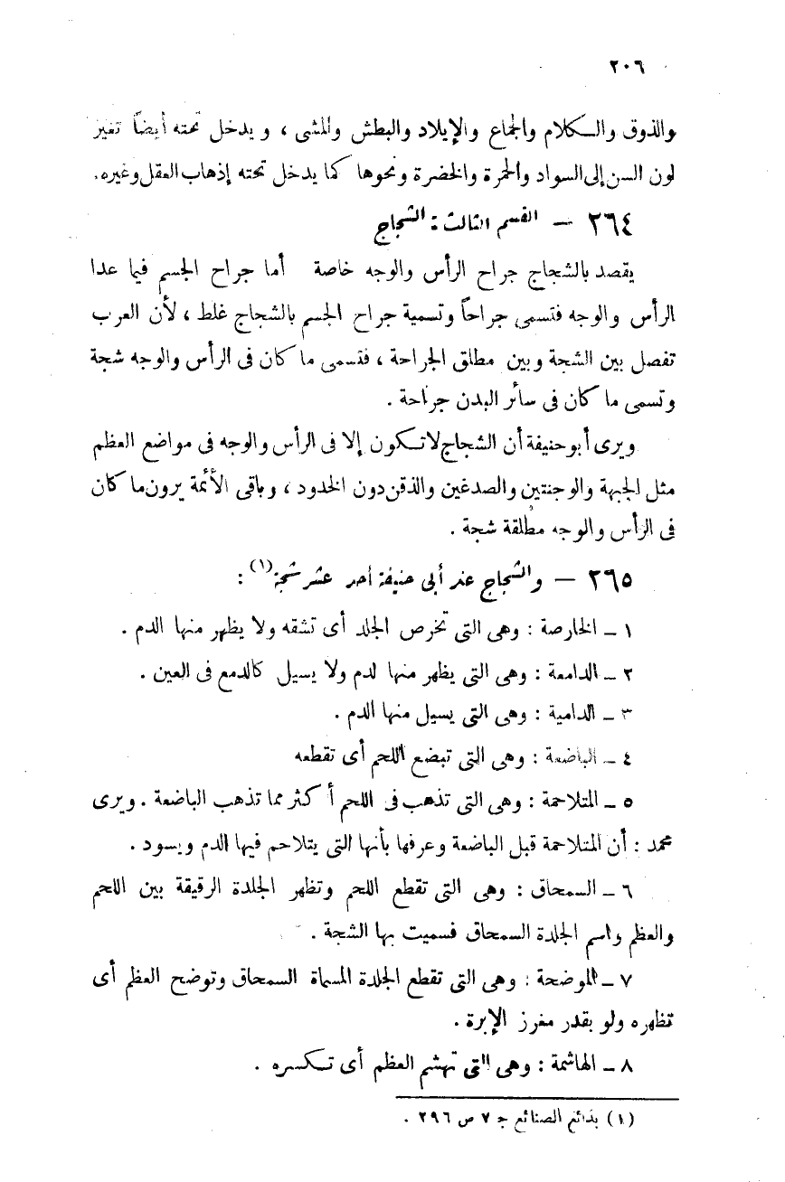 264- القسم الثالث: الشجاج: يقصد بالشجاج جراح الرأس والوجه خاصة. أما جراح الجسم فيما عدا الرأس والوجه فتسمى جراحًا، وتسمية جراح الجسم بالشجاج غلظ؛ لأن العرب تفصل بين الشجة وبين مطلق الجراحة، فتسمى ما كان فى الرأس والوجه شجه، وتسمى ما كان فى سائر البدن جراحة.