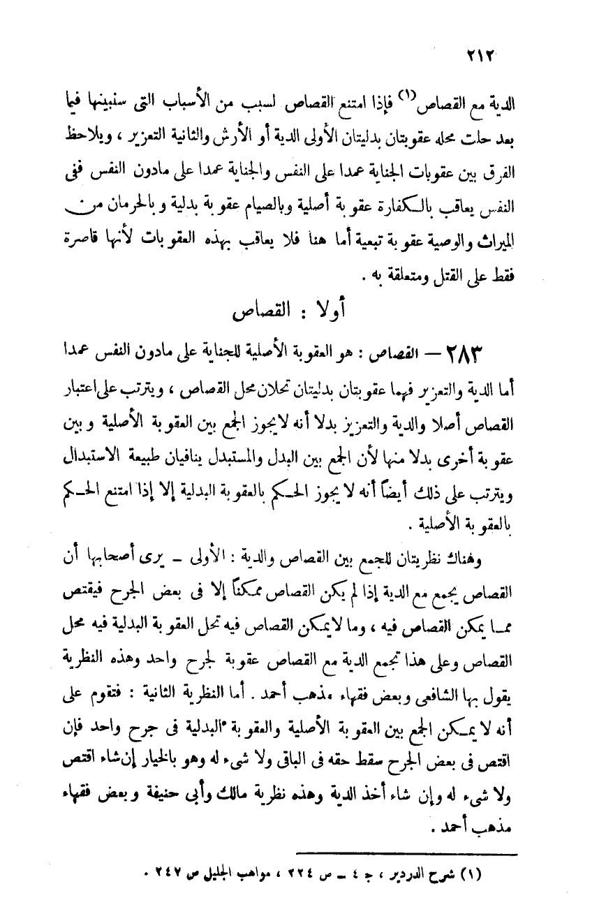 283- القصاص: هو العقوبة الأصلية للجناية على ما دون النفس عمدًا، أما الدية والتعزير فهما عقوبتان بدليتان تحلان محل القصاص، ويترتب على اعتبار القصاص أصلاً والدية والتعزير بدلاً أنه لا يجوز الجمع بين العقوبة الأصلية وبين عقوبة أخرى بدلاً منها لأن الجمع بين البدل والمستبدل ينافيان طبيعة الاستبدال، ويترتب على ذلك أيضًا أنه لا يجوز الحكم بالعقوبة البدلية إلا إذا امتنع الحكم بالعقوبة الأصلية.