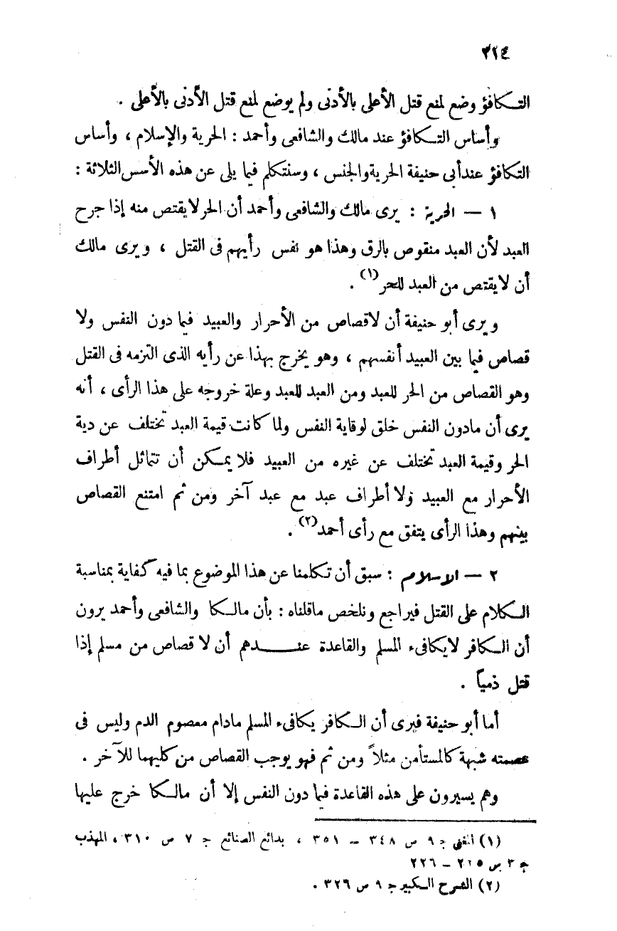 2- الإسلام: سبق أن تكلمنا على هذا الموضوع بما فيه كفاية بمناسبة الكلام على القتل فليراجع، ونلخص ما قلناه بأن مالكًا والشافعى وأحمد يرون أن الكافر لا يكافئ المسلم، والقاعدة عندهم أن لا قصاص من مسلم إذا قتل ذميًا.