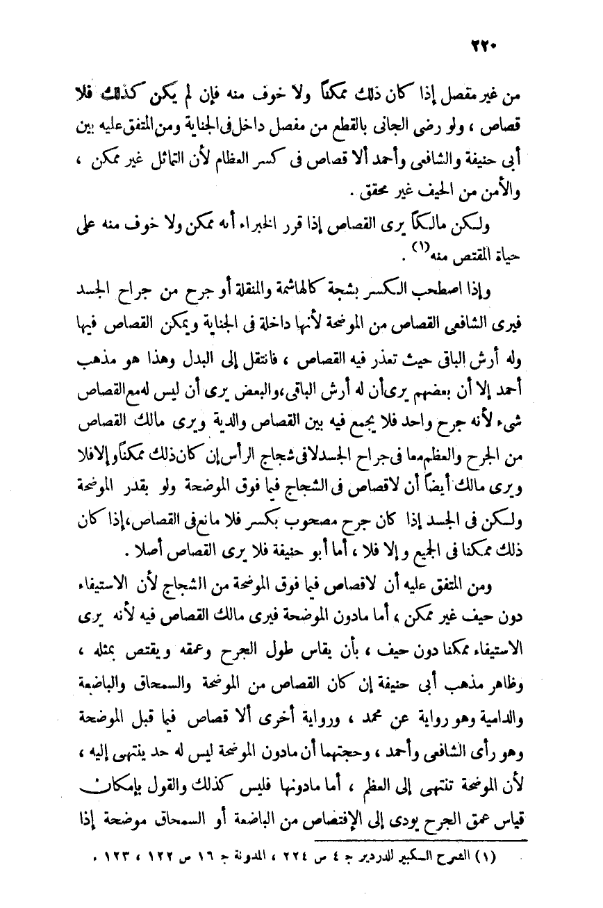 من غير مفصل إذا كان ذلك ممكنًا ولا خوف منه، فإن لم يكن كذلك فلا قصاص ولو رضى الجانى بالقطع من مفصل داخل فى الجناية، ومن المتفق عليه بين أبى حنيفة والشافعى وأحمد ألا قصاص فى كسر العظام لأن التماثل غير ممكن، والأمن من الحيف غير محقق.