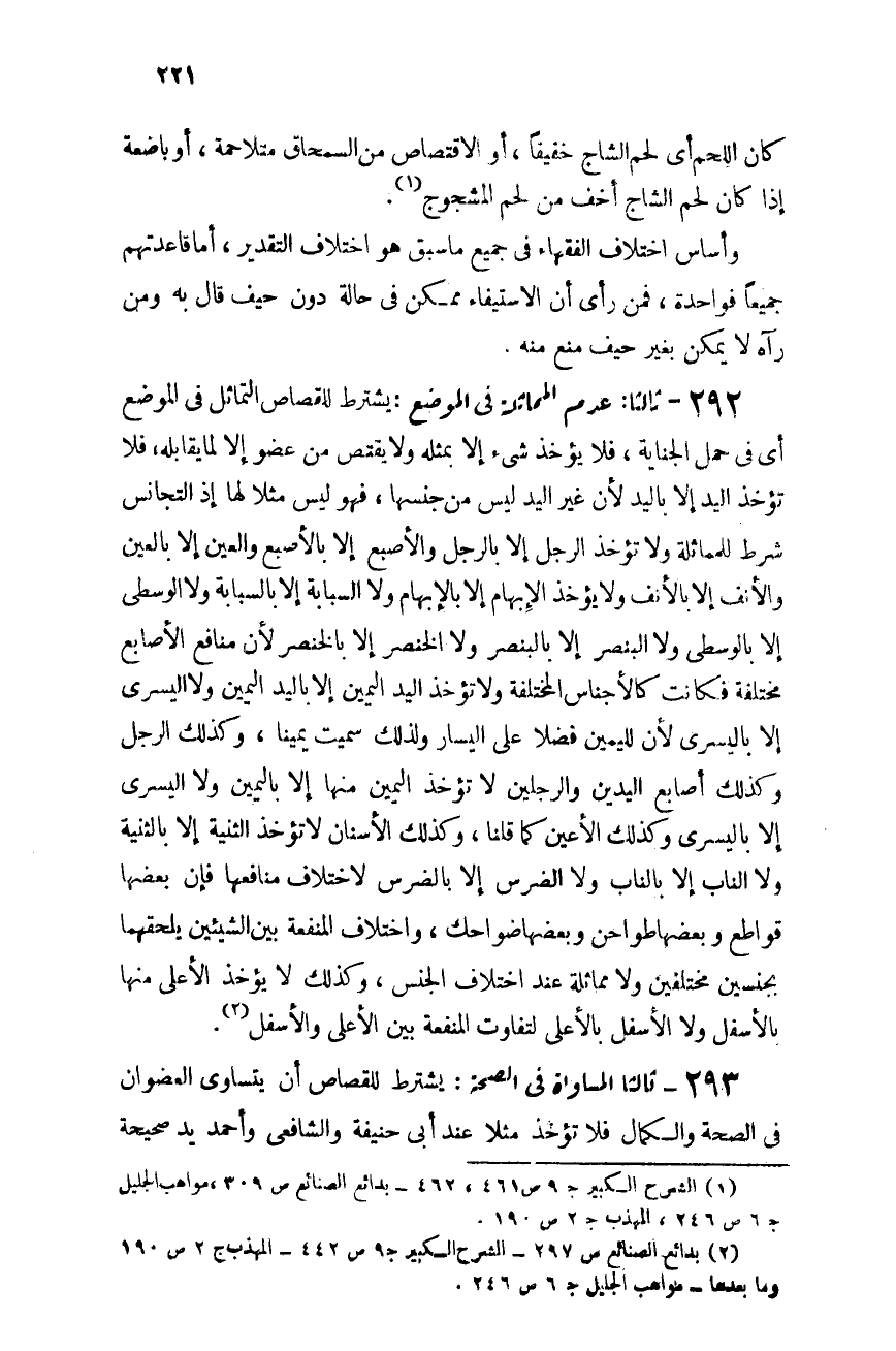 293- ثالثًا: المساواة فى الصحة: يشترط للقصاص أن يتساوى العضوان فى الصحة والكمال فلا تؤخذ مثلاً عند أبى حنيفة والشافعى وأحمد يد صحيحة