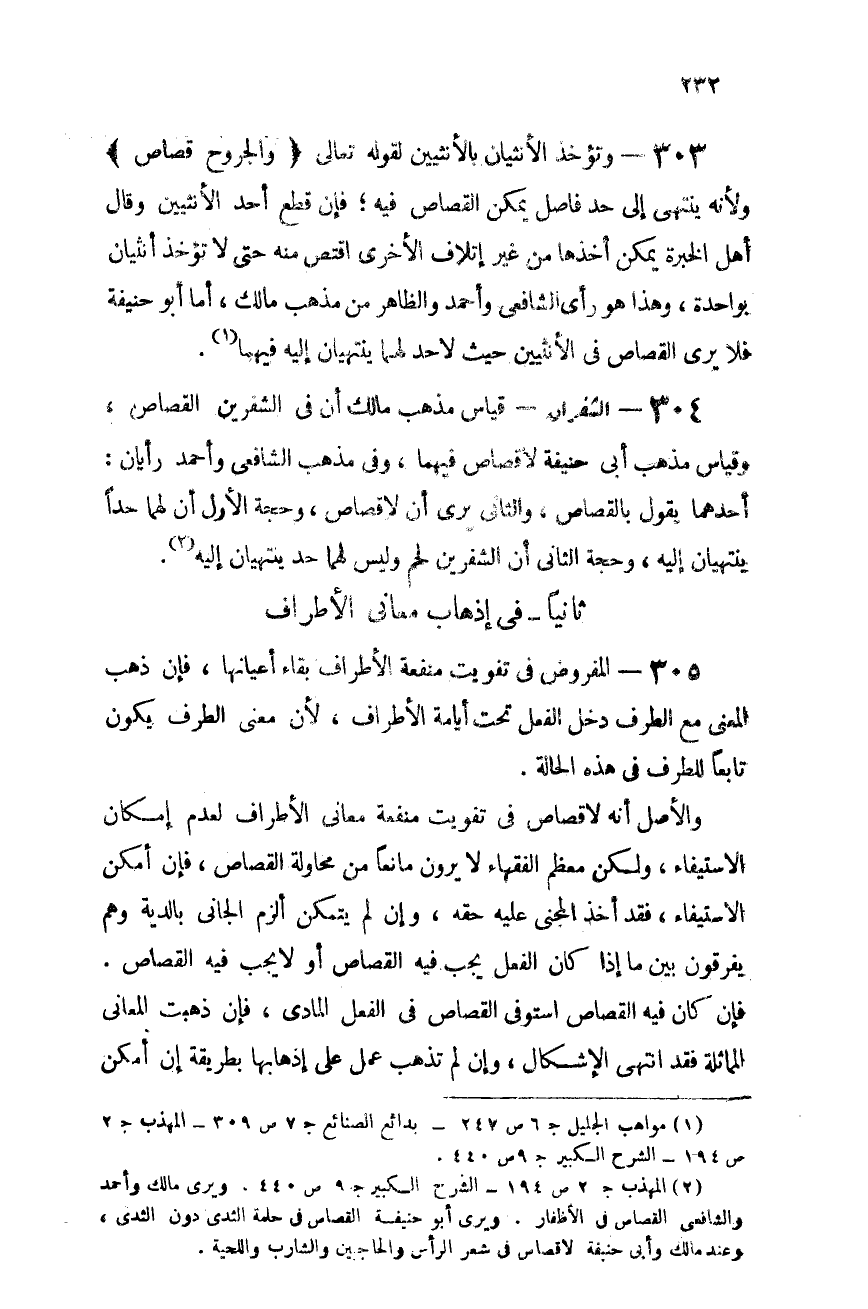 305- المفروض فى تفويت منفعة الأطراف بقاء أعيانها: فإن ذهب المعنى مع الطرف دخل الفعل تحت إبانة الأطراف، لأن معنى الطرف يكون تابعًا للطرف فى هذه الحالة.