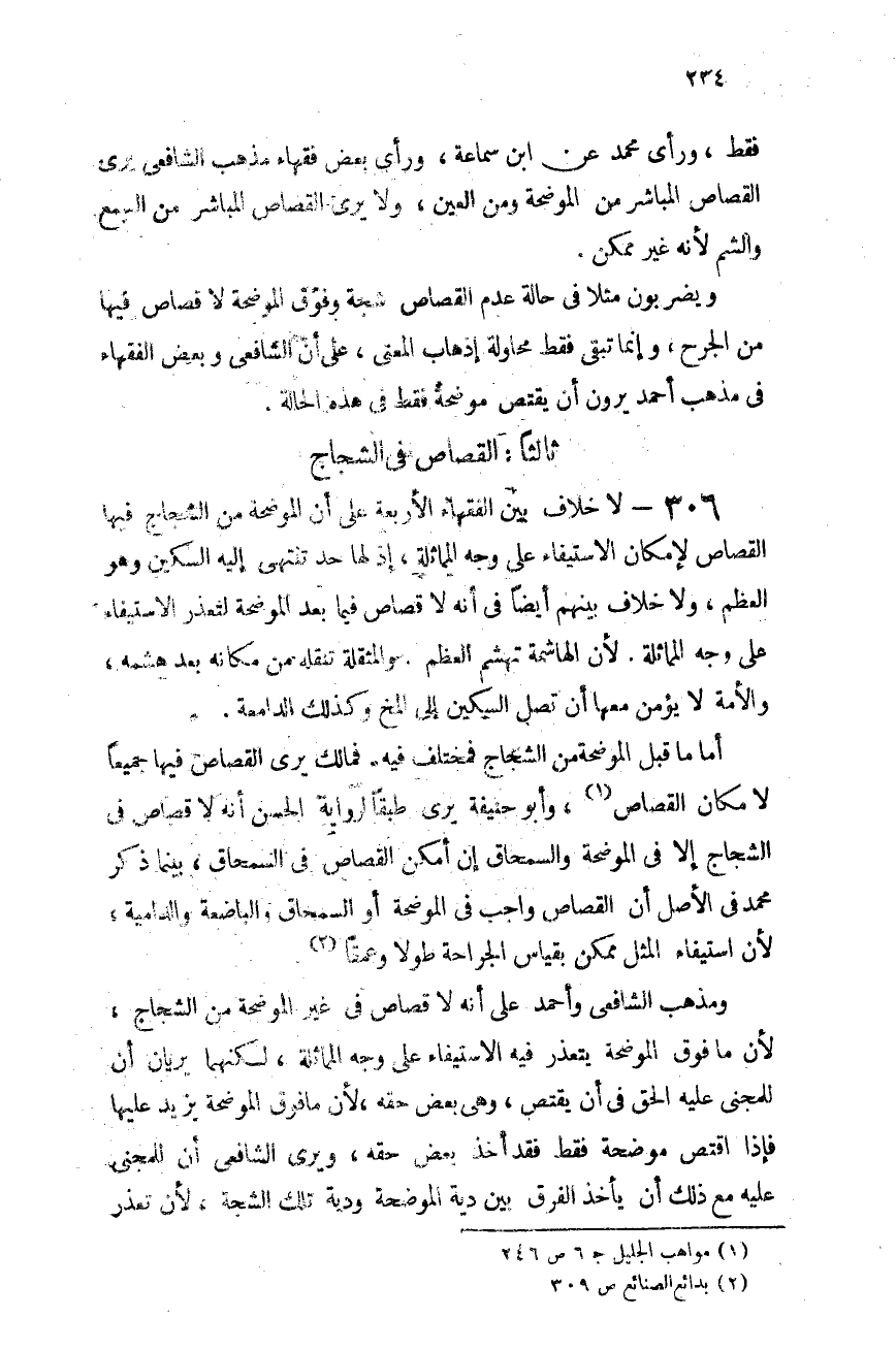 ويضربون مثلاً فى حالة عدم القصاص: شجة وفوق الموضحة، لا قصاص فيها من الجرح، وإنما تبقى فقط محاولة إذهاب المعنى، على أن الشافعى وبعض الفقهاء فى مذهب أحمد يرون أن يقتص موضحة فقط فى هذه الحالة.
