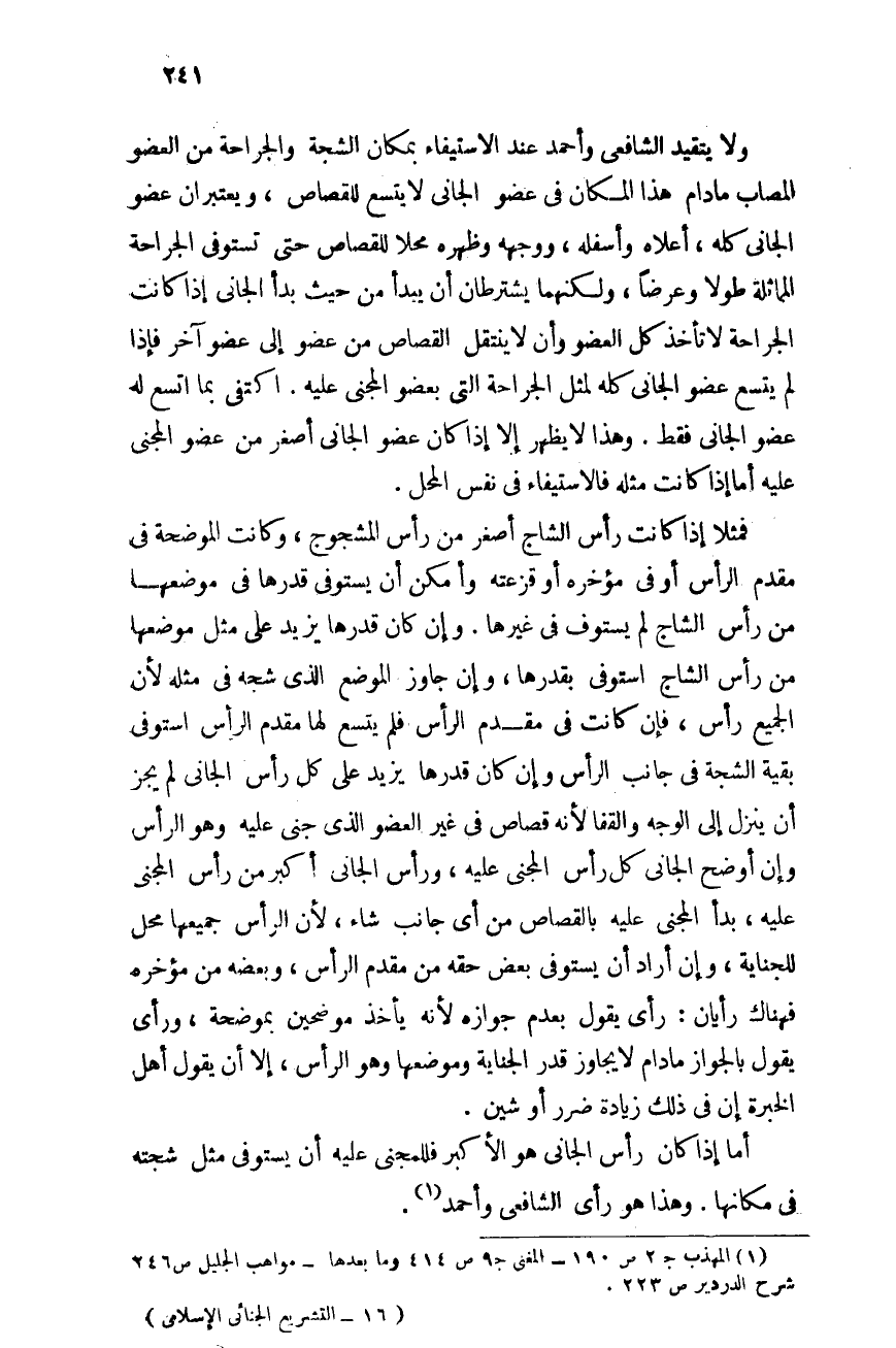 ولا يتقيد الشافعى وأحمد عند الاستيفاء بمكان الشجة والجراحة من العضو المصاب ما دام هذا المكان فى عضو الجانى لا يتسع للقصاص، ويعتبران عضو الجانى كله أعلاه وأسفله ووجهه وظهره محلاً للقصاص حتى تستوفى الجراحة المماثلة طولاً وعرضًا، ولكنهما يشترطان أن يبدأ من حيث بدأ الجانى إذا كانت الجراحة لا تأخذ كل العضو، وأن لا ينتقل القصاص من عضو إلى عضو آخر، فإذا لم يتسع عضو الجانى كله لمثل الجراحة التى بعضو المجنى عليه اكتفى بما اتسع له عضو الجانى فقط. وهذا لا يظهر إلا إذا كان عضو الجانى أصغر من عضو المجنى عليه أما إذا كانت مثله فالاستيفاء فى نفس المحل.