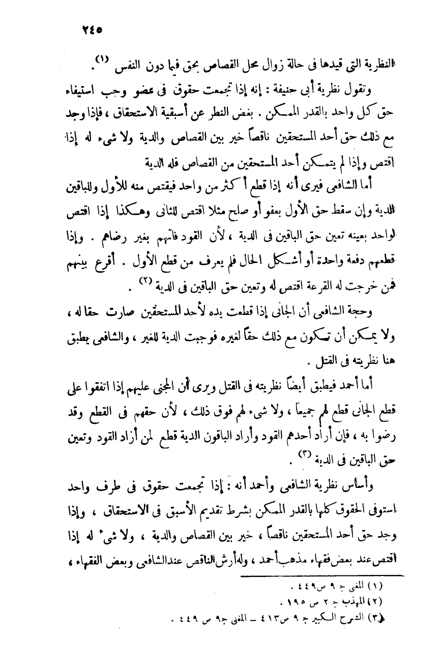 وأساس نظرية الشافعى وأحمد أنه: إذا تجمعت حقوق فى طرف واحد استوفى الحقوق كلها بالقدر الممكن بشرط تقديم الأسبق فى الاستحقاق، وإذا وجد حق أحد المستحقين ناقصًا خير بين القصاص والدية، ولا شئ له إذا اقتص عند بعض فقهاء مذهب أحمد، وله أرش الناقص عند الشافعى وبعض الفقهاء،