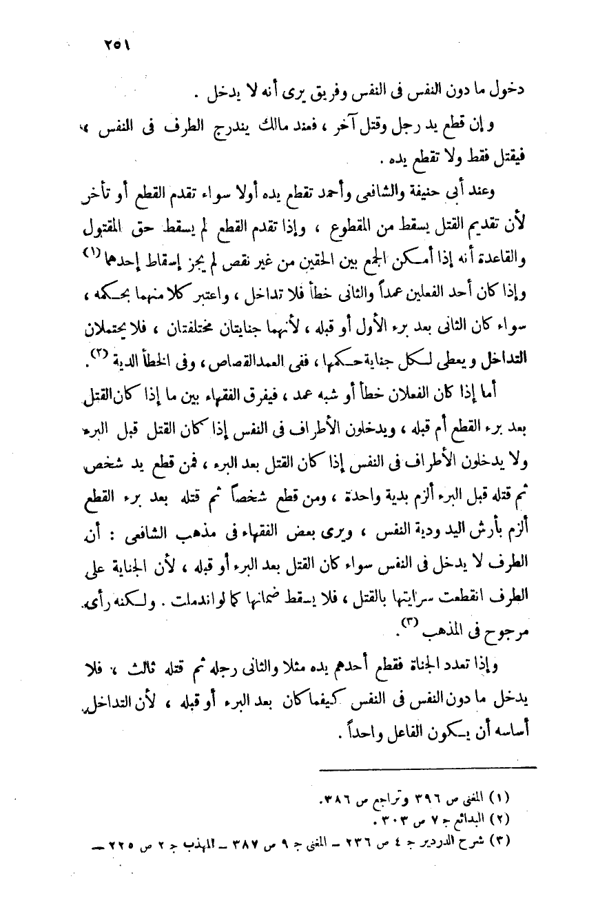وإذا تعدد الجناة فقطع أحدهم يده مثلاً والثانى رجله ثم قتله ثالث، فلا يدخل ما دون النفس فى النفس كيفما كان بعد البرء أو قبله، لأن التداخل أساسه أن يكون الفاعل واحدًا.