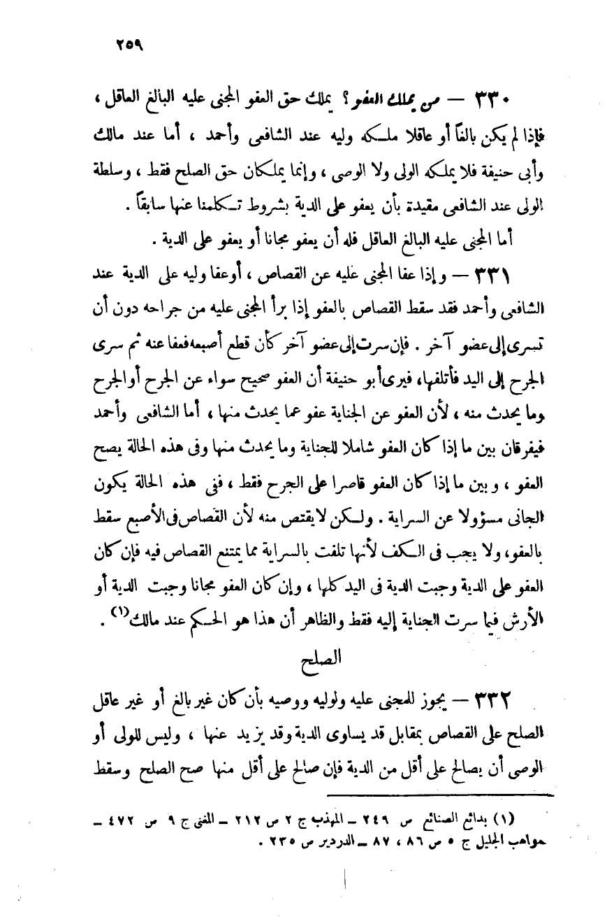 330- من يملك العفو؟: يملك حق العفو المجنى عليه البالغ العاقل، فإذا لم يكن بالغًا أو عاقلاً ملكه وليه عند الشافعى وأحمد، أما عند مالك وأبى حنيفة فلا يملكه الولى ولا الوصى، وإنما يملكان حق الصلح فقط، وسلطة الولى عند الشافعى مقيدة بأن يعفو على الدية بشروط تكلمنا عنها سابقًا.