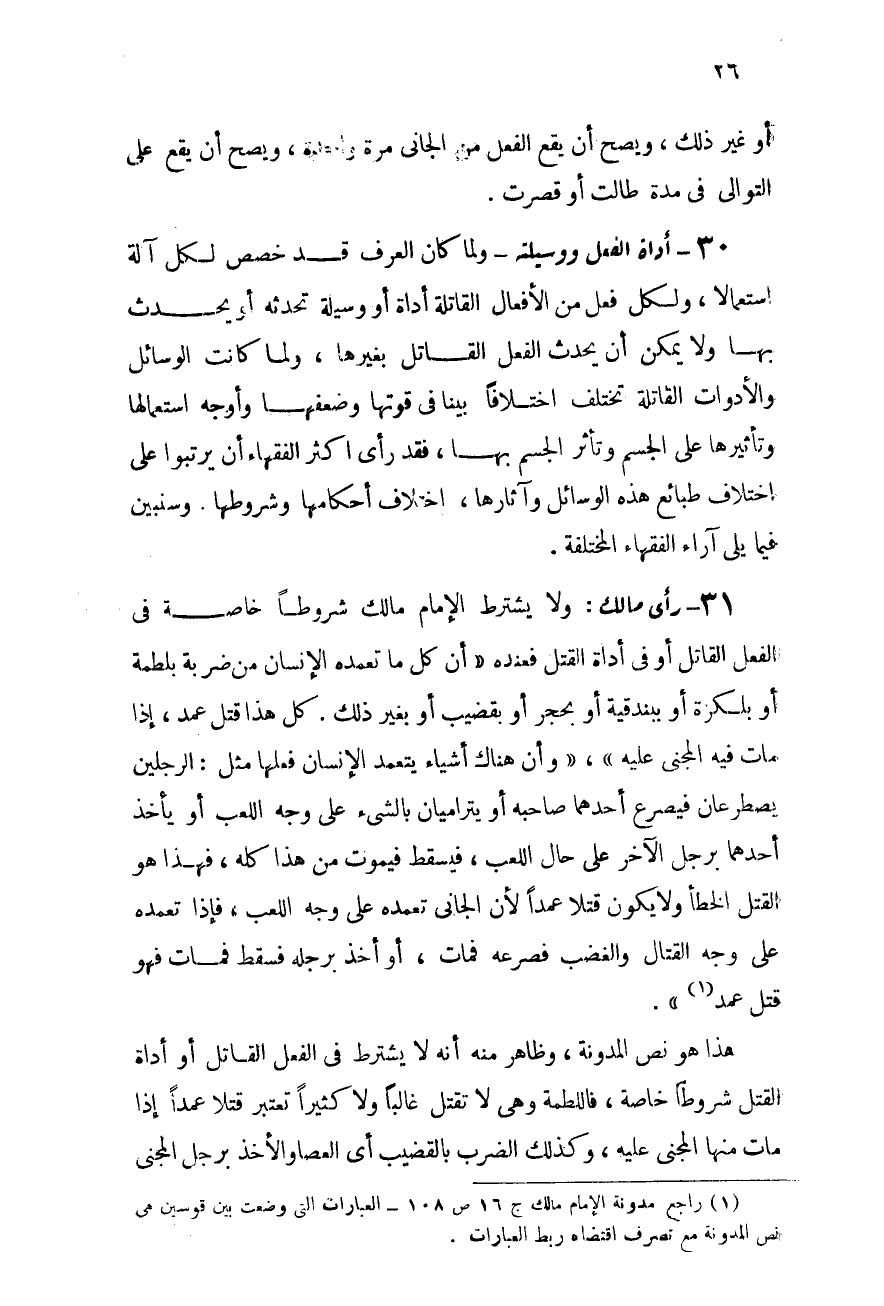 30 - أداة الفعل ووسيلته: ولما كان العرف قد خصص لكل آلة استعمالاً، ولكل فعل من الأفعال القاتلة أداة أو وسيلة تحدثه أو يحدث بها ولا يمكن أن يحدث الفعل القاتل بغيرها، ولما كانت الوسائل والأدوات القاتلة تختلف اختلافًا بينًا فى قوتها وضعفها وأوجه استعمالها وتأثيرها على الجسم وتأثر الجسم بها، فقد رأى أكثر الفقهاء أن يرتبوا على اختلاف طبائع هذه الوسائل وآثارها اختلاف أحكامها وشروطها. وسنبين فيما يلى آراء الفقهاء المختلفة.