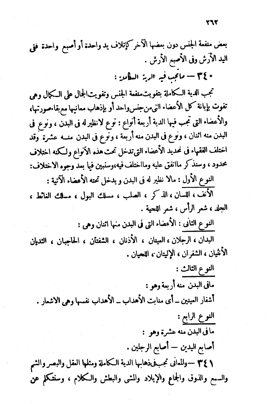 340- ما تجب فيه الدية الكاملة: تجب الدية الكاملة بتفويت منفعة الجنس وتفويت الجمال على الكمال، وهى تفوت بإبانة كل الأعضاء التى من جنس واحد أو بإذهاب معانيها مع بقاء صورتها، والأعضاء التى تجب فيها الدية أربعة أنواع: نوع لا نظير له فى البدن، ونوع فى البدن منه اثنان، ونوع فى البدن منه أربعة، ونوع فى البدن منه عشرة. وقد اختلف الفقهاء فى تحديد الأعضاء التى تدخل تحت هذه الأنواع ولكنه اختلاف محدود، وسنذكر ما تفق عليه وما اختلف فيه، وسنبين فيما بعد وجوه الاختلاف.