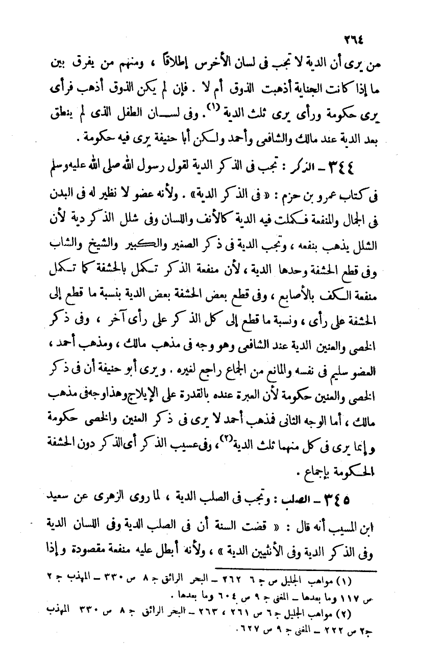 345- الصلب: وتجب فى الصلب الدية، لما روى الزهرى عن سعيد بن المسيب أنه قال: "قضت السنة أن فى الصلب الدية، وفى اللسان الدية، وفى الذكر الدية، وفى الأنثيين الدية"، ولأنه أبطل عليه منفعة مقصودة. وإذا