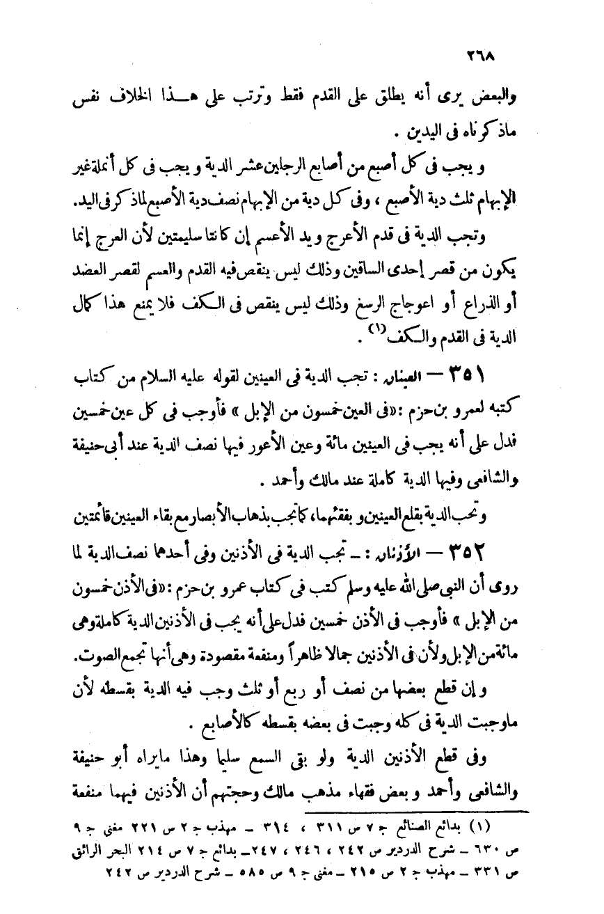 351- العينان: تجب الدية فى العينين؛ لقوله عليه السلام من كتاب كتبه لعمرو بن حزم: "فى العين خمسون من الإبل" فأوجب فى كل عين خمسين فدل عل أنه يجب فى العينين مائة. وعين الأعور فيها نصف الدية عند أبى حنيفة والشافعى، وفيها الدية كاملة عند مالك وأحمد.