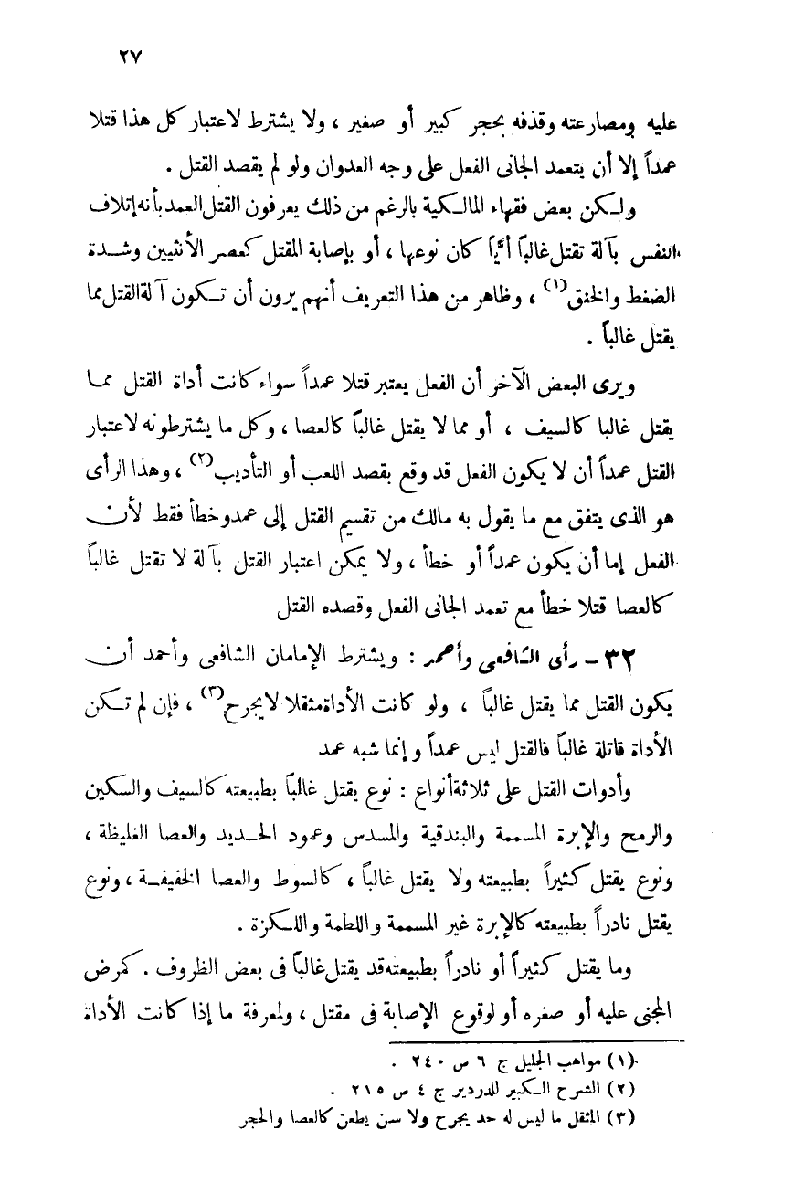 32 - رأى الشافعى وأحمد: ويشترط الإمامان الشافعى وأحمد أن يكون القتل مما يقتل غالبًا ولو كانت الأداة مثقلاً لا يجرح (¬3) ، فإن لم تكن الأداة قاتلة غالبًا فالقتل ليس عمدًا وإنما شبه عمد.