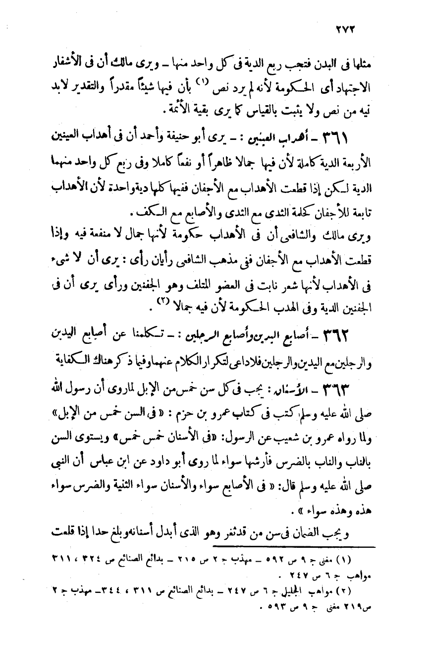 361- أهداب العينين: يرى أبو حنيفة وأحمد أن فى أهداب العينين الأربعة الدية كاملة لأن فيها جمالاً ظاهرًا ونفعًا كاملاً، وفى ربع كل واحد منها الدية، لكن إذا قطعت الأهداب مع الأجفان ففيها كلها دية واحدة؛ لأن الأهداب تابعة للأجفان كحلمة الثدى مع الثدى والأصابع مع الكف.
