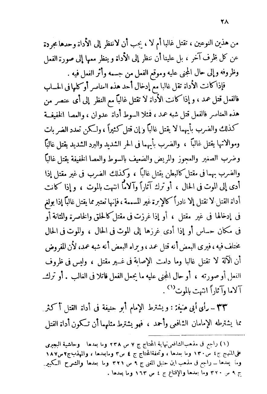 33 - رأى أبى حنيفة: ويشترط الإمام أبو حنيفة فى أداة القتل أكثر مما يشترطه الإمامان الشافعى وأحمد، فهو يشترط مثلهما أن تكون أداة القتل