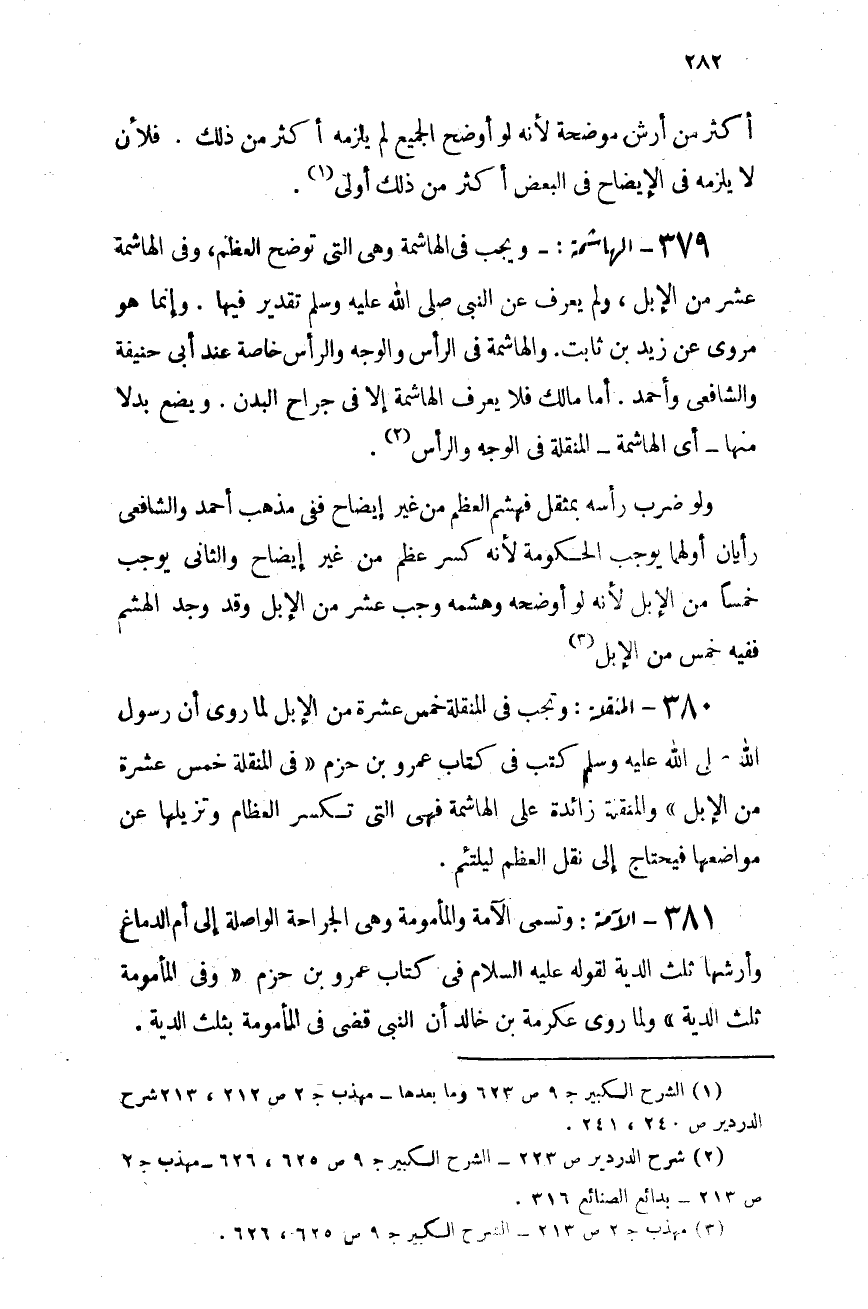379 - الهاشمة: ويجب فى الهاشمة - وهى التى توضح العظم - عشر من الإبل، ولم يعرف عن النبى - صلى الله عليه وسلم - تقدير فيها، وإنما هو مروى عن زيد بن ثابت. والهاشمة فى الرأس والوجه والرأس خاصة عند أبى حنيفة والشافعى وأحمد. أما مالك فلا يعرف الهاشمة إلا فى جراح البدن، ويضع بدلاً منها - أى الهاشمة - المنقلة فى الوجه والرأس (¬2) .
