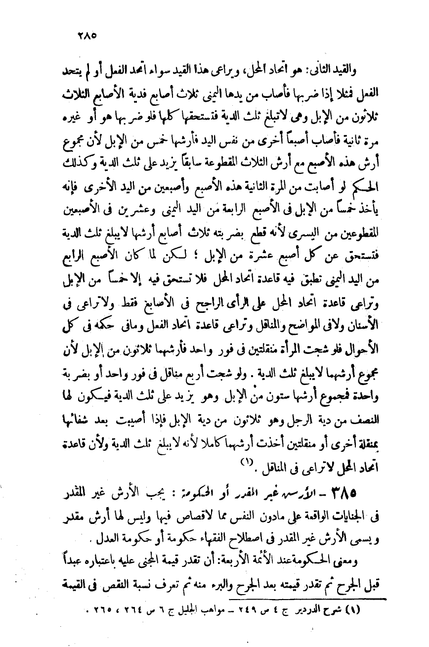 والقيد الثانى: هو اتحاد المحل، ويراعى هذا القيد سواء اتحد الفعل أو لم يتحد الفعل، فمثلاً إذا ضربها فأصاب من يدها اليمنى ثلاث أصابع فدية الأصابع الثلاث ثلاثون من الإبل وهى لا تبلغ ثلث الدية فتستحقها كلها، فلو ضربها هو أو غيره مرة ثانية فأصاب إصبعًا أخرى من نفس اليد فأرشها خمس من الإبل لأن مجموع أرش هذه الإصبع مع أرش الثلاث المقطوعة سابقًا يزيد على ثلث الدية. وكذلك الحكم لو أصابت من المرة الثانية هذه الإصبع وإصبعين من اليد الأخرى فإنه يأخذ خمسًا من الإبل فى الإصبع الرابعة من اليد اليمنى وعشرين فى الإصبعين المقطوعين من اليسرى لأنه قطع بضربته ثلاث أصابع أرشها لا يبلغ ثلث الدية فتستحق عن كل إصبع عشرة من الإبل؛ لكن لما كان الإصبع الرابع من اليد اليمنى تطبق فيه قاعدة اتحاد المحل فلا تستحق فيه إلا خمسًا من الإبل، وتراعى قاعدة اتحاد المحل على الرأى الراجح فى الأصابع فقط ولا تراعى فى الأسنان ولا فى المواضح والمناقل، وتراعى قاعدة اتحاد الفعل وما فى حكمه فى كل الأحوال فلو شجت المرأة منقلتين فى فور واحد فأرشهما ثلاثون من الإبل لأن مجموع أرشهما لا يبلغ ثلث الدية، ولو شجت أربع مناقل فى فور واحد أو بضربة واحدة فمجموع أرشها ستون من الإبل وهو يزيد على ثلث الدية فيكون لها النصف من دية الرجل وهو ثلاثون من دية الإبل، فإذا أصيبت بعد شفائها بمنقلة أخرى أو منقلتين أخذت أرشهما كاملاً لأنه لا يبلغ ثلث الدية ولأن قاعدة اتحاد المحل لا تراعى فى المناقل (¬1) .