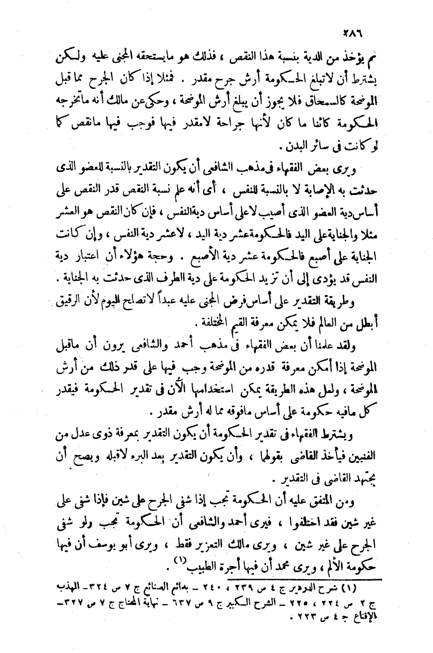 ولقد علمنا أن بعض الفقهاء فى مذهب أحمد والشافعى يرون أن ما قبل الموضحة إذا أمكن معرفة قدره من الموضحة وجب فيها على قدر ذلك من أرش الموضحة، ولعل هذه الطريقة يمكن استخدامها الآن فى تقدير الحكومة؛ فيقدر كل ما فيه حكومة على أساس ما فوقه مما له أرش مقدر.