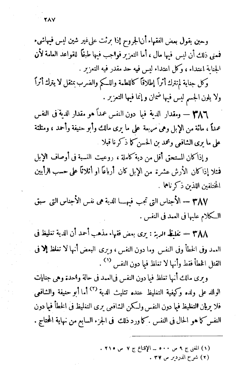 386- مقدار الدية فيما دون النفس عمدًا هو مقدار الدية فى النفس عمدًا: مائة من الإبل، وهى مربعة على ما يرى مالك وأبو حنيفة وأحمد، ومثلثة على ما يرى الشافعى ومحمد بن الحسن كما ذكرنا قبلاً.
