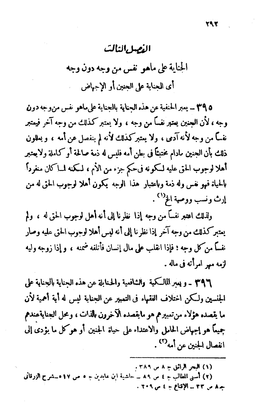 395- يعبر الحنفية عن هذه الجناية بالجناية على ما هو نفس من وجه دون وجه؛ لأن الجنين يعتبر نفسًا من وجه، ولا يعتبر كذلك من وجه آخر، فيعتبر نفسًا من وجه لأنه آدمى، ولا يعتبر كذلك لأنه لم ينفصل عن أمه، ويعللون ذلك بأن الجنين ما دام مختبئًا فى بطن أمه فليس له ذمة صالحة أو كاملة ولا يعتبر أهلاً لوجوب الحق عليه لكونه فى حكم جزء من الأم، لكنه لما كان منفردًا بالحياة فهو نفس وله ذمة وباعتبار هذا الوجه يكون أهلاً بوجوب الحق له من إرث ونسب ووصية ... إلخ (¬1) .