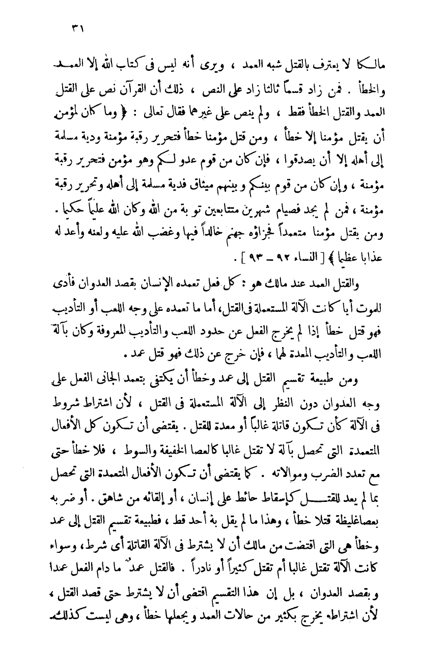 مالكًا لا يعترف بالقتل شبه العمد، ويرى أنه ليس فى كتاب الله إلا العمد والخطأ فمن زاد قسمًا ثالثًا زاد على النص ذلك أن القرآن نص على القتل العمد والقتل الخطأ فقط ولم ينص على غيرهما فقال تعالى: {مَا كَانَ لِمُؤْمِنٍ أَن يَقْتُلَ مُؤْمِنًا إِلاَّ خَطَئًا وَمَن قَتَلَ مُؤْمِنًا خَطَئًا فَتَحْرِيرُ رَقَبَةٍ مُّؤْمِنَةٍ وَدِيَةٌ مُّسَلَّمَةٌ إِلَى أَهْلِهِ إِلاَّ أَن يَصَّدَّقُوا فَإِن كَانَ مِن قَوْمٍ عَدُوٍّ لَّكُمْ وَهُوَ مُؤْمِنٌ فَتَحْرِيرُ رَقَبَةٍ مُّؤْمِنَةٍ وَإِن كَانَ مِن قَوْمٍ بَيْنَكُمْ وَبَيْنَهُم مِّيثَاقٌ فَدِيَةٌ مُّسَلَّمَةٌ إِلَى أَهْلِهِ وَتَحْرِيرُ رَقَبَةٍ مُّؤْمِنَةٍ فَمَن لَّمْ يَجِدْ فَصِيَامُ شَهْرَيْنِ مُتَتَابِعَيْنِ تَوْبَةً مِّنَ اللَّهِ وَكَانَ اللَّهُ عَلِيمًا حَكِيمًا * وَمَن يَقْتُلْ مُؤْمِنًا مُّتَعَمِّدًا فَجَزَاؤُهُ جَهَنَّمُ خَالِدًا فِيهَا وَغَضِبَ اللَّهُ عَلَيْهِ وَلَعَنَهُ وَأَعَدَّ لَهُ عَذَابًا عَظِيمًا} [النساء: 92, 93] .