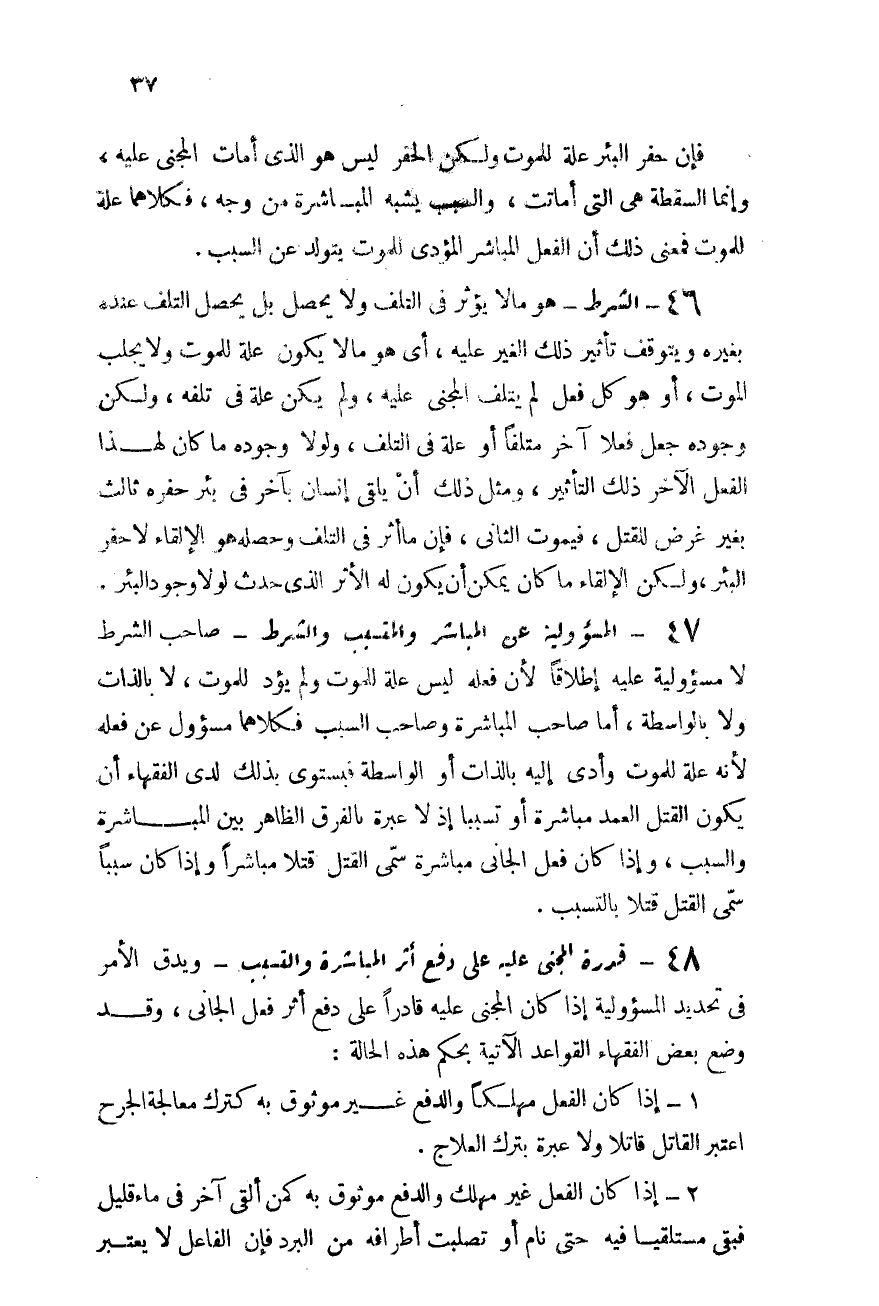 47 - المسئولية عن المباشرة والمتسبب والشرط: صاحب الشرط لا مسئولية عليه إطلاقًا لأن فعله ليس علة للموت ولم يؤد للموت لا بالذات ولا بالواسطة أما صاحب المباشرة وصاحب السبب فكلاهما مسئول عن فعله لأنه علة للموت وأدى إليه بالذات أو الواسطة، فيستوى بذلك لدى الفقهاء أن يكون القتل العمد مباشرة أو تسببًا إذ لا عبرة بالفرق الظاهر بين المباشرة والسبب وإذا كان فعل الجانى مباشرة سمى القتل قتلاً مباشرًا وإذا كان سببًا سمى القتل قتلاً بالتسبب.
