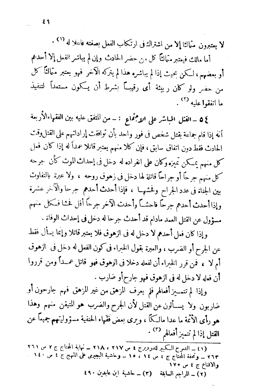 54 - القتل المباشر على الاجتماع: من المتفق عليه بين الفقهاء الأربعة أنه إذا قام جماعة بقتل شخص فى فور واحد بأن توافقت إرادتهم على القتل وقت الحادث فقط دون اتفاق سابق فإن كلاً منهم يعتبر قاتلاً عمدًا له إذا كان فعل كل منهم يمكن تميزه وكان على انفراده له دخل فى إحداث الموت؛ كأن جرحه كل منهم جرحًا أو جراحًا قاتلة لها دخل فى زهوق روحه ولا عبرة بالتفاوت بين الجناة فى عدد الجراح وفُحشْها، فإذا أحدث أحدهم جرحا والآخر عشرة، وإذا أحدث أحدهم جرحًا فاحشًا وأحدث الآخر جرحًا أقل فحشًا فكل منهم مسئول عن القتل العمد ما دام قد أحدث جرحًا له دخل فى إحداث الوفاة.