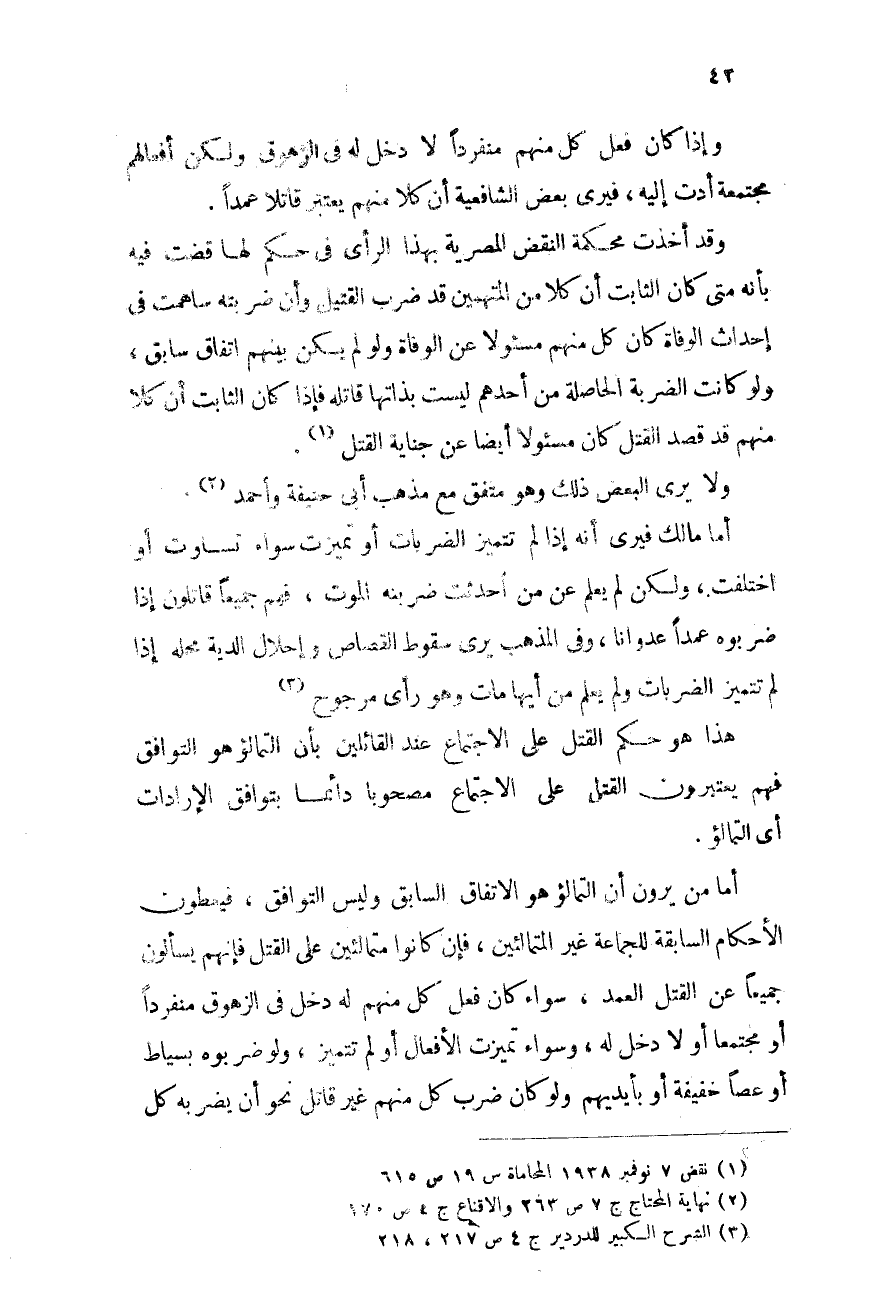 وقد أخذت محكمة النقض المصرية بهذا الرأى فى حكم لها قضت فيه بأنه متى كان الثابت أن كلاً من المتهمين قد ضرب القتيل وأن ضربته ساهمت فى إحداث الوفاة كان كل منهم مسئولاً عن الوفاة ولو لم يكن بينهم اتفاق سابق ولو كانت الضربة الحاصلة من أحدهم ليست بذاتها قاتلة، فإذا كان الثابت أن كلاً منهم قد قصد القتل كان مسئولاً أيضًا عن جناية القتل (¬1) .