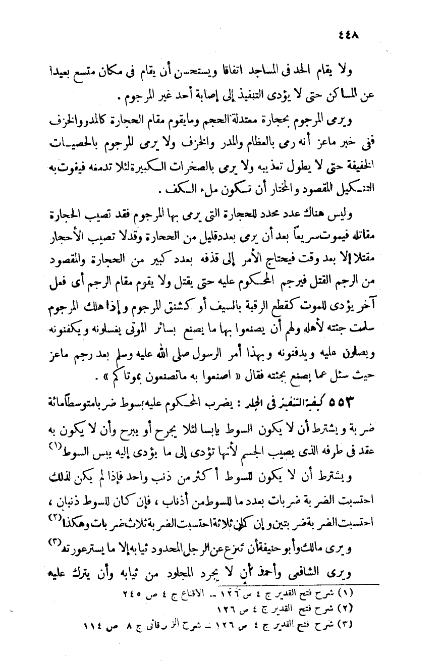 ولا يقام الحد فى المساجد اتفاقًا، ويستحسن أن يقام فى كل مكان متسع بعيدًا عن المساكن حتى لا يؤدى التنفيذ إلى إصابة أحد غير المرجوم.