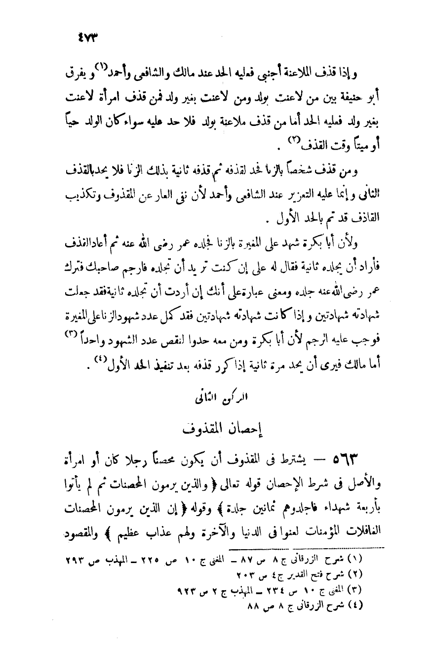 563 - يشترط فى المقذوف أن يكون محصنًا رجلًا كان أو امرأة: والأصل فى شرط الإحصان قوله تعالى: {وَالَّذِينَ يَرْمُونَ الْمُحْصنَاَتِ الْغَافِلاتِ الْمُؤْمِناَتِ لُعِنُوا فِى الدُّنْياَ واَلآخِرَةِ وَلَهُمْ عَذَابٌ عَظِيمٌ} [النور: 23] والمقصود