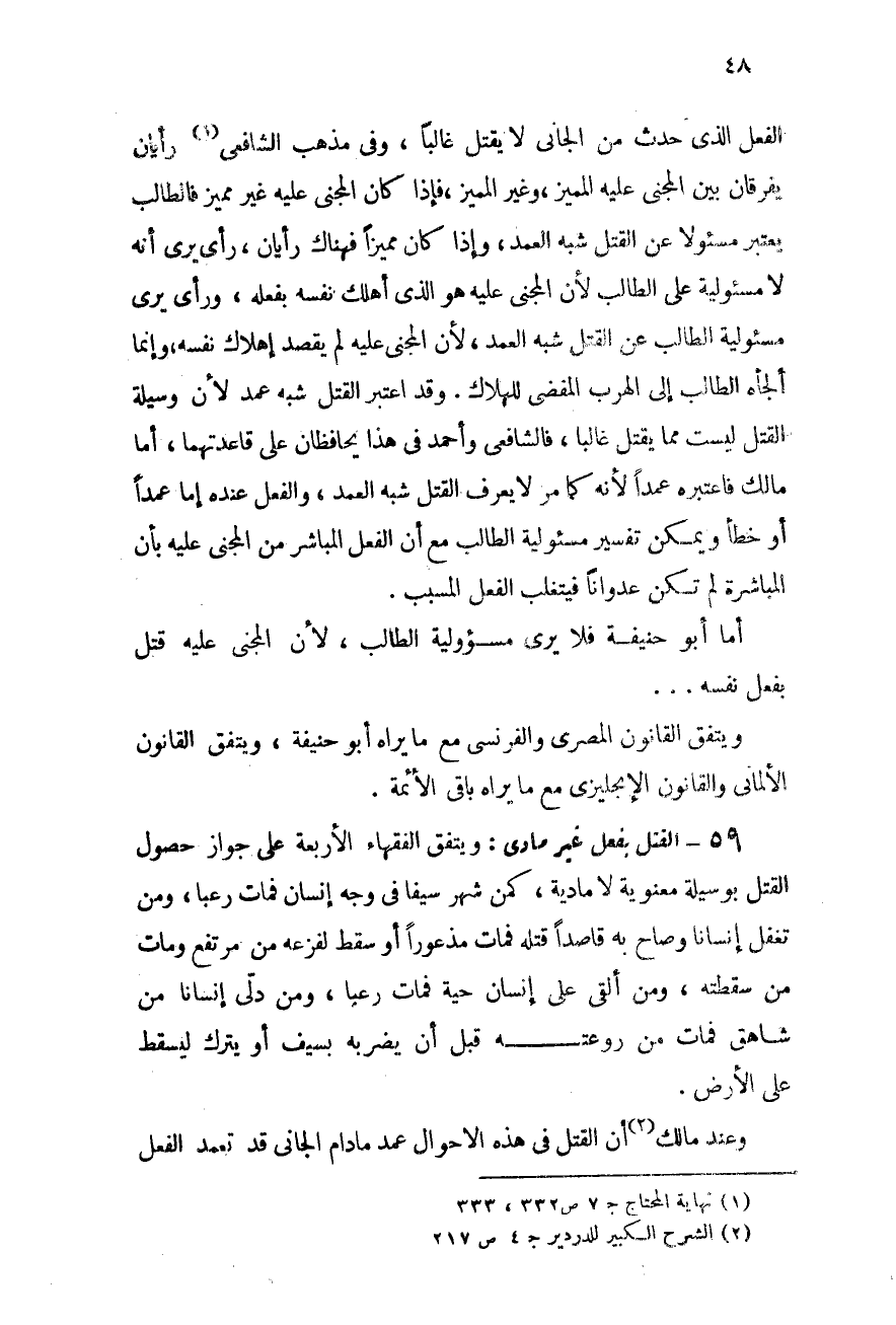59- القتل بفعل غير مادى: ويتفق الفقهاء لأربعة على جواز حصول القتل بوسيلة معنوية لا مادية كمن شهر سيفًا فى وجه إنسان فمات رعبًا، ومن تغفل إنسانًا وصاح به قاصدًا قتله فمات مذعورًا أو سقط لفزعه من مرتفع ومات من سقطته ومن ألقى على إنسان حية فمات رعبًا، ومن دلّى إنسانًا من شاهق فمات من روعته قبل أن يضربه بسيف أو يُترك ليسقط على الأرض.